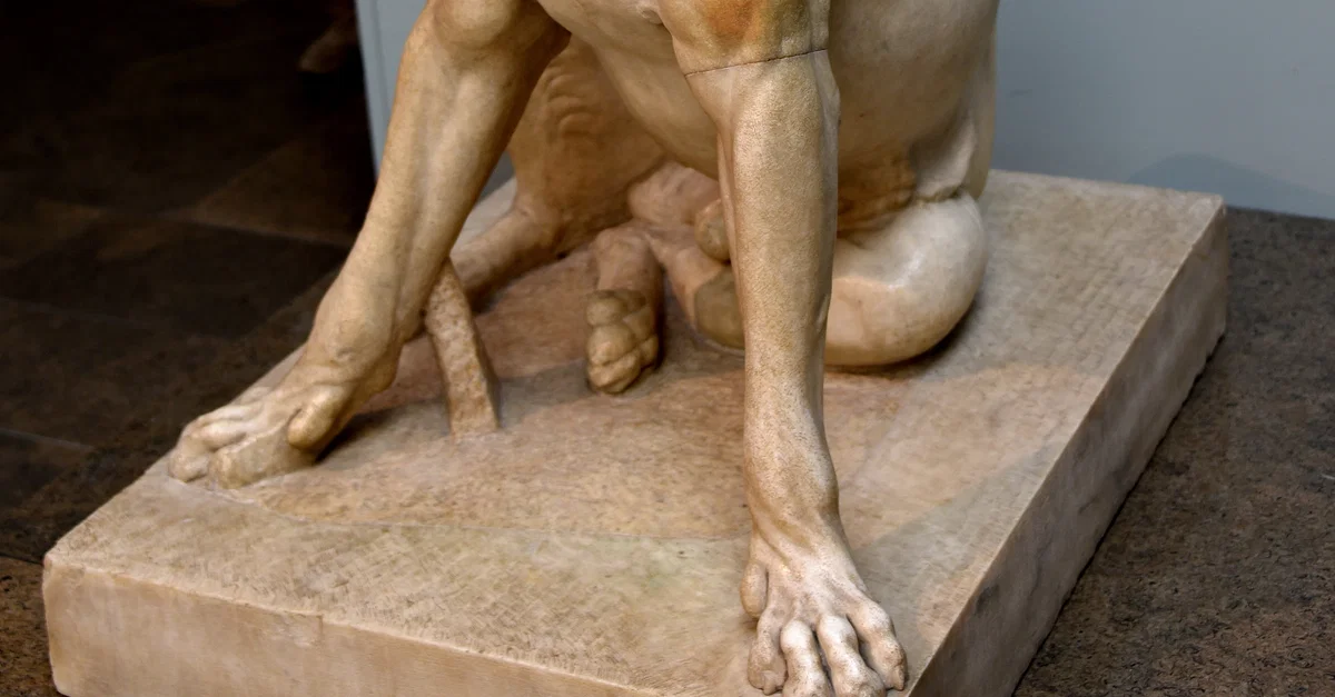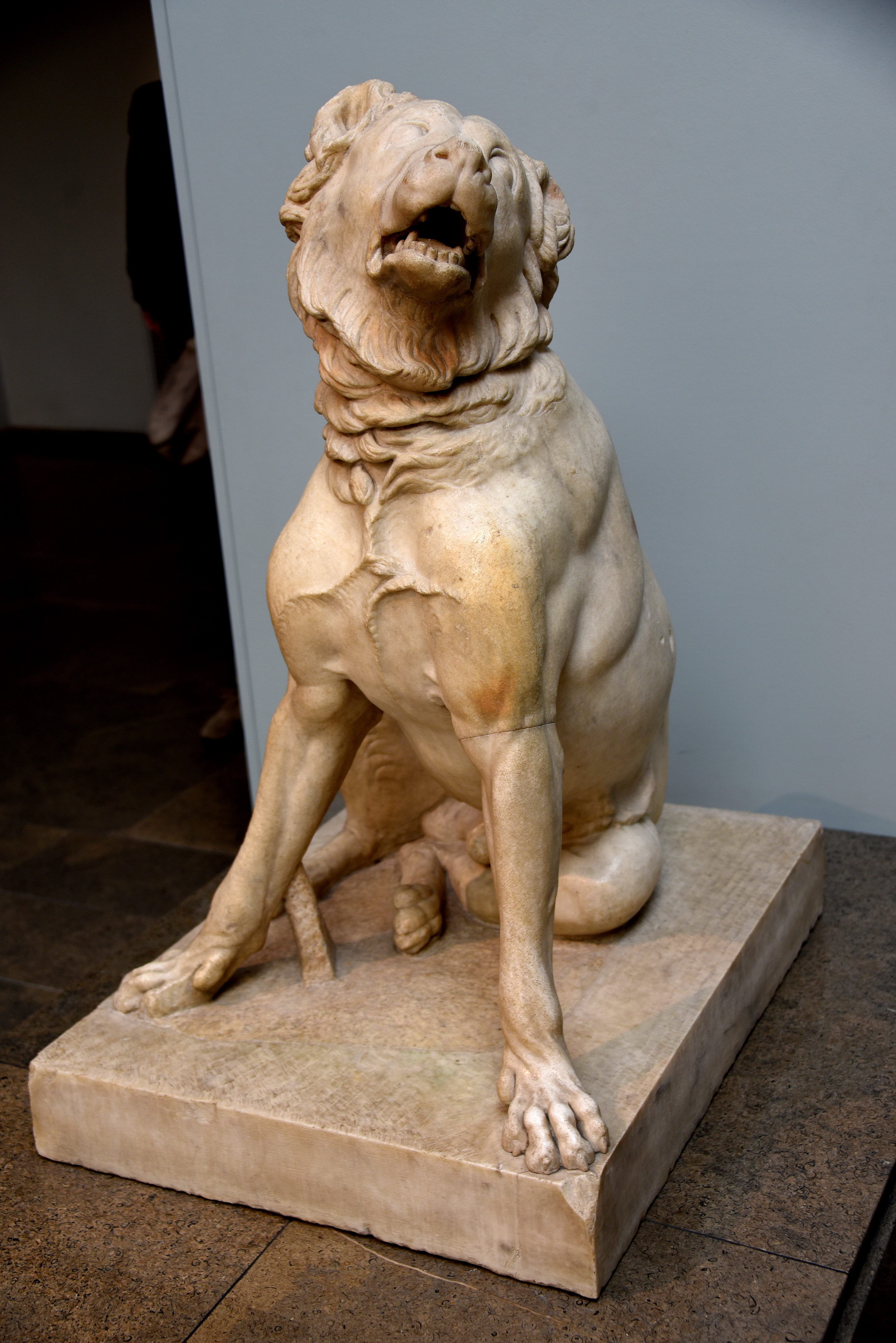 The Molossi inhabited ancient Epirus (modern northern Greece and Albania). This dog once wore a collar. Its gaping jaws show powerful teeth, but the relaxed pose and upward gaze give it an obedient air. Five other versions of this sculpture, all found near Rome, are thought to be Roman copies of a lost Greek bronze original, probably of the 2nd century CE. This version is sometimes known as the "Jennings Dog" because it was once owned by Henry Constantine Jennings (1731-1819), who bought it in Rome in the 1750s.