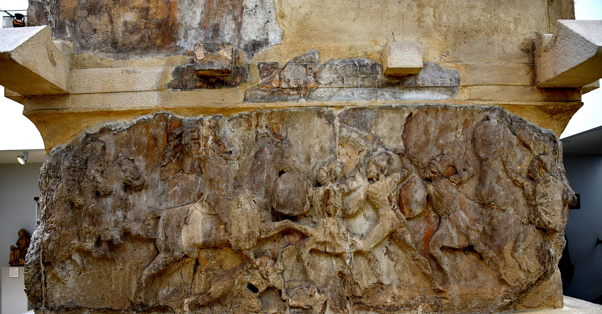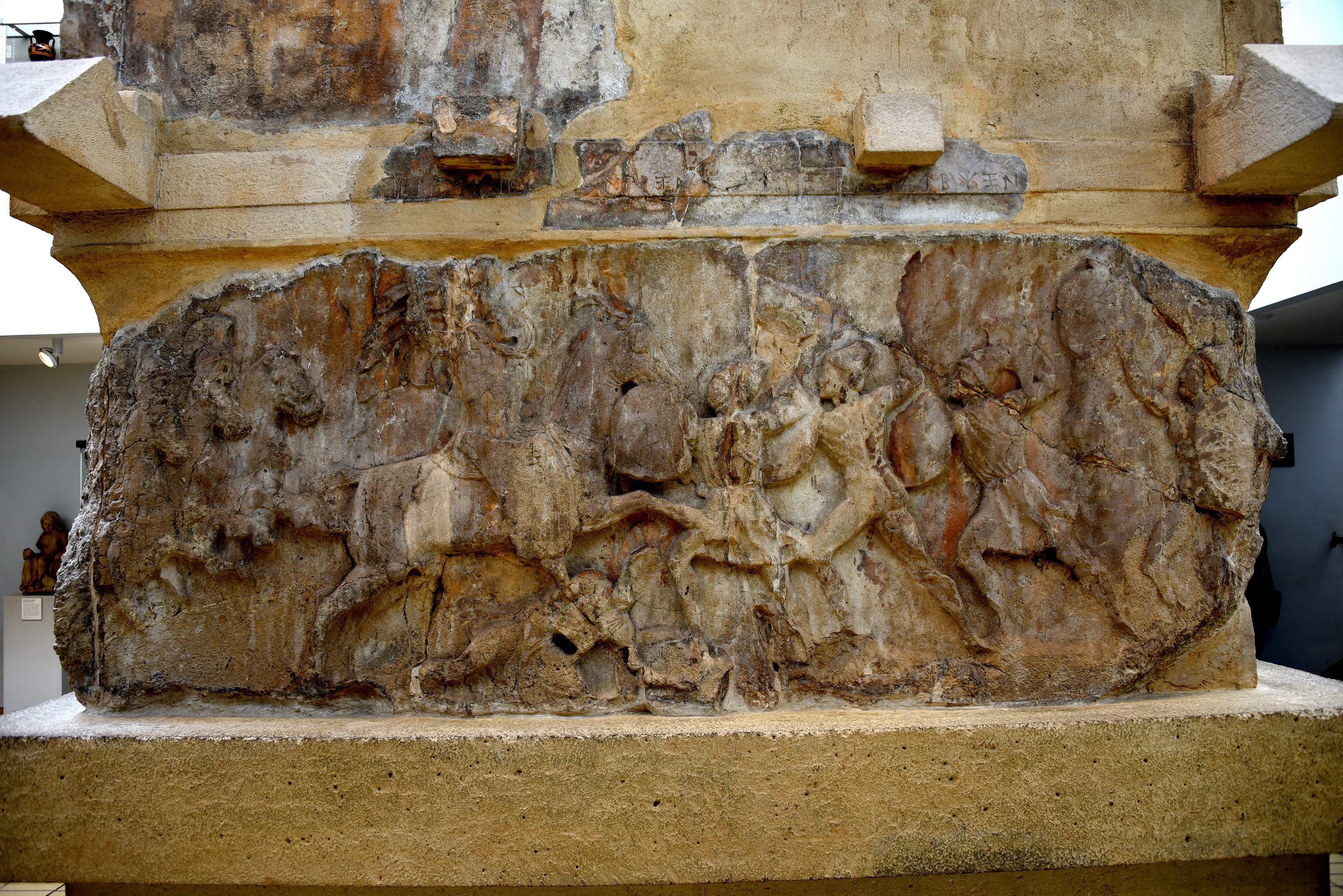 This relief, which is seen on the east side of the Payava Tomb, depicts a battle of cavalry and foot soldiers. The inscriptions in Lycian record that the tomb was built by Payava. The Payava tomb is a limestone tomb with gabled roof. It was decorated with reliefs on its four sides and inscribed with Lycian inscriptions. It was made in Lycia; found in Xanthus. Greek Period, circa 375-362 BCE. (The British Museum, London)