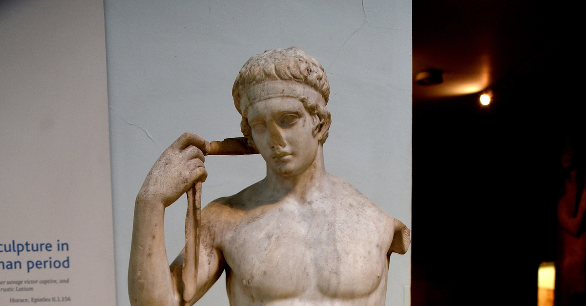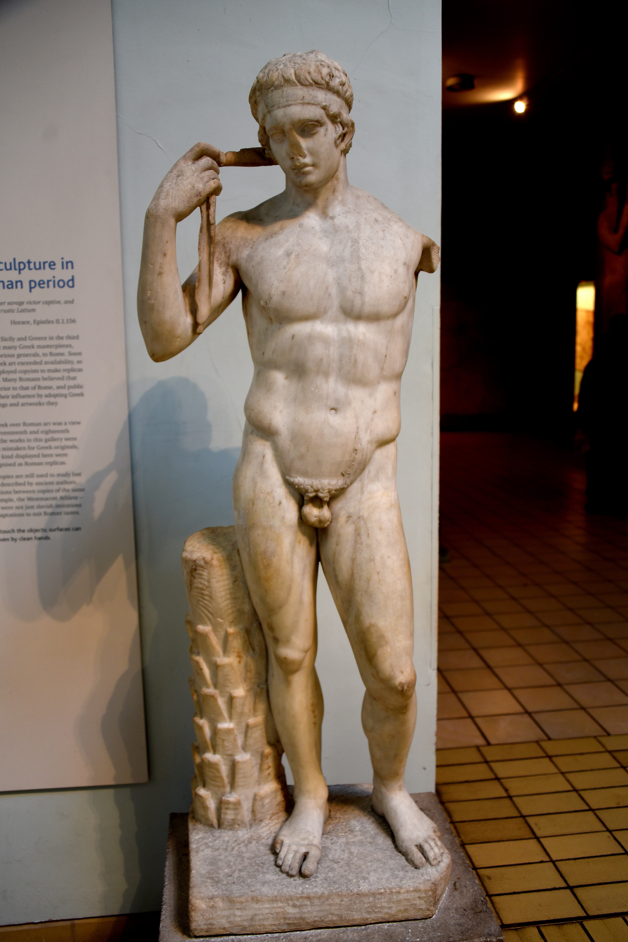 The statue shows a young athlete tying a ribbon around his head, signifying that he has just won a competition. Which event the youth won is unknown but athletic figures of this type were a common theme in Greek art. A victor statue by the sculptor Pheidias of a boy binding a ribbon around his head was dedicated at Olympia, according to ancient writers. This marble statue is thought to be a later Roman version of that original Greek bronze figure, now lost. The palm tree trunk was not part of the Greek original, but palm fronds symbolized sporting victory. Roman, mid-1st century CE, probably a version of a Greek original of about 430 BCE. Formerly in the Farnese Collection, Naples; known as the Farnese Diadoumenos (ribbon-wearer). The British Museum, London.