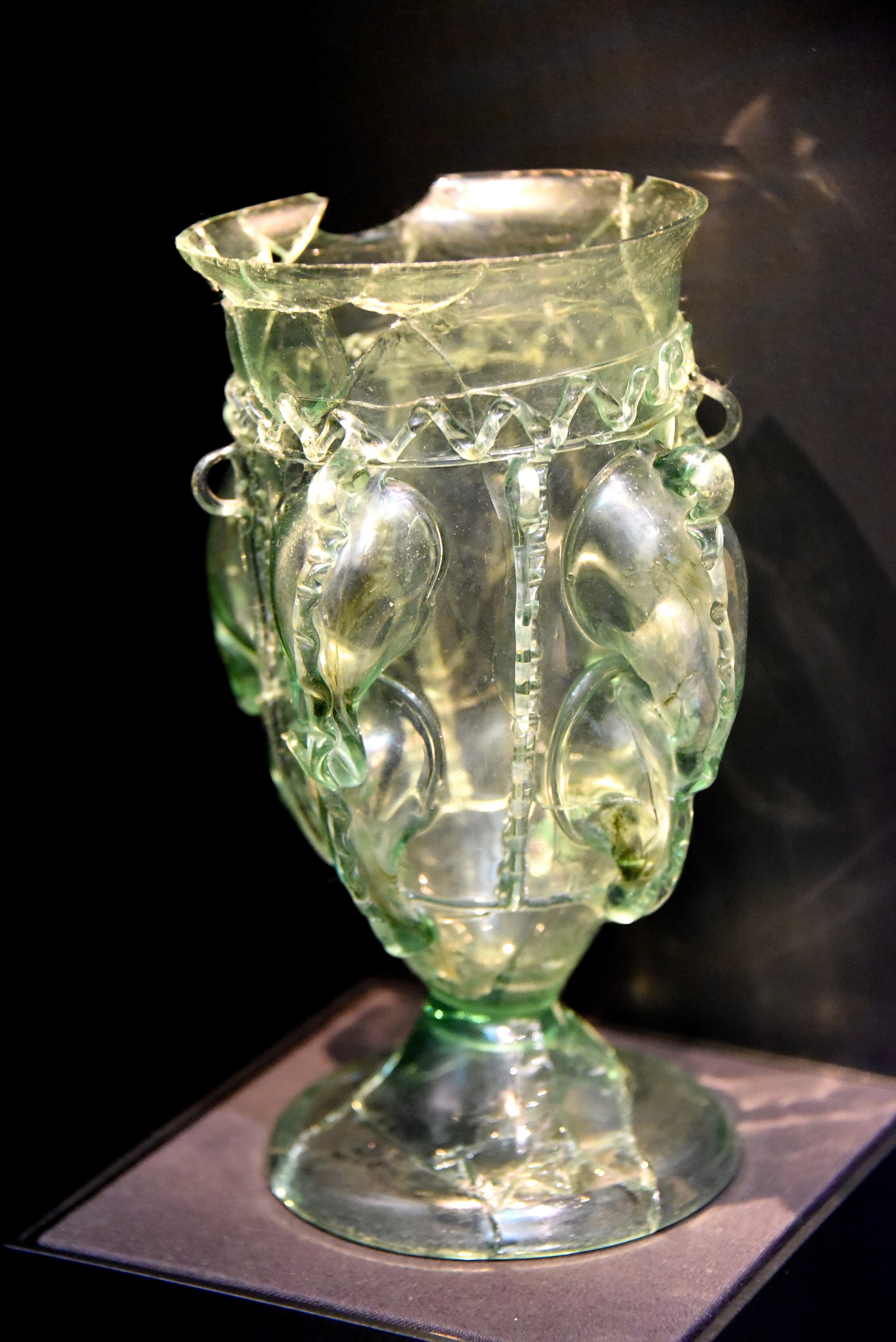 This glass vessel, known as a claw beaker after its claw-like decoration, is an early example of a type that grew popular throughout Anglo-Saxon England. Its form is similar to Late Roman vessels, reflecting the cultural transitions that took place in this time of migration and settlement. The beaker came from a woman's grave dating to the mid-500s CE, and was therefore around 100 years old when buried. Perhaps, it was a a prized heirloom, passed on through generations. From Mucking, Essex, England, UK. (The British Museum, London)