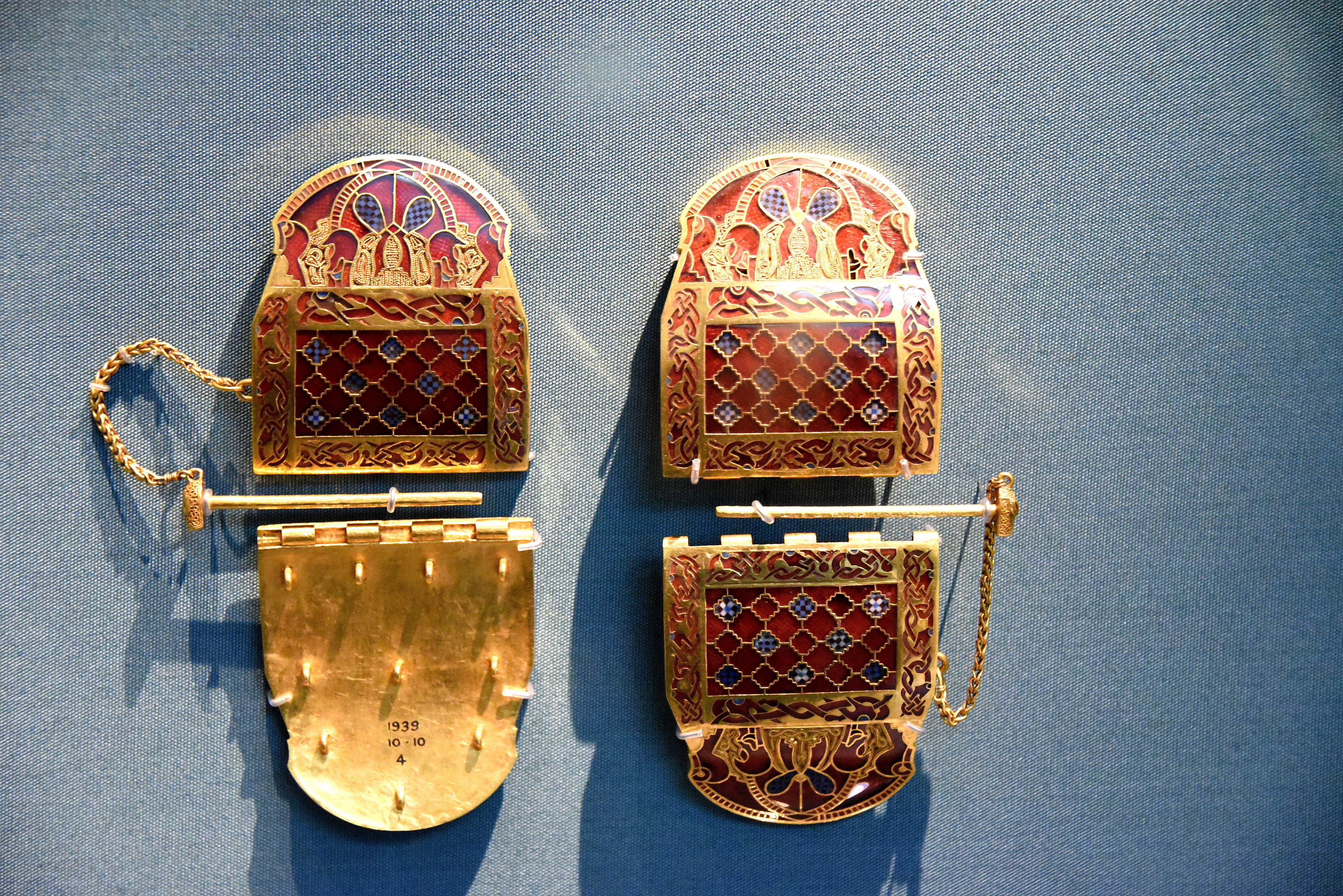 Gold shoulder-clasps from Sutton Hoo, Ship-burial Mound 1, England, UK. Late 500s to early 600s.
