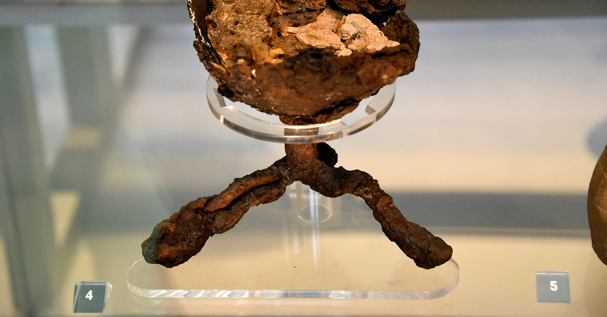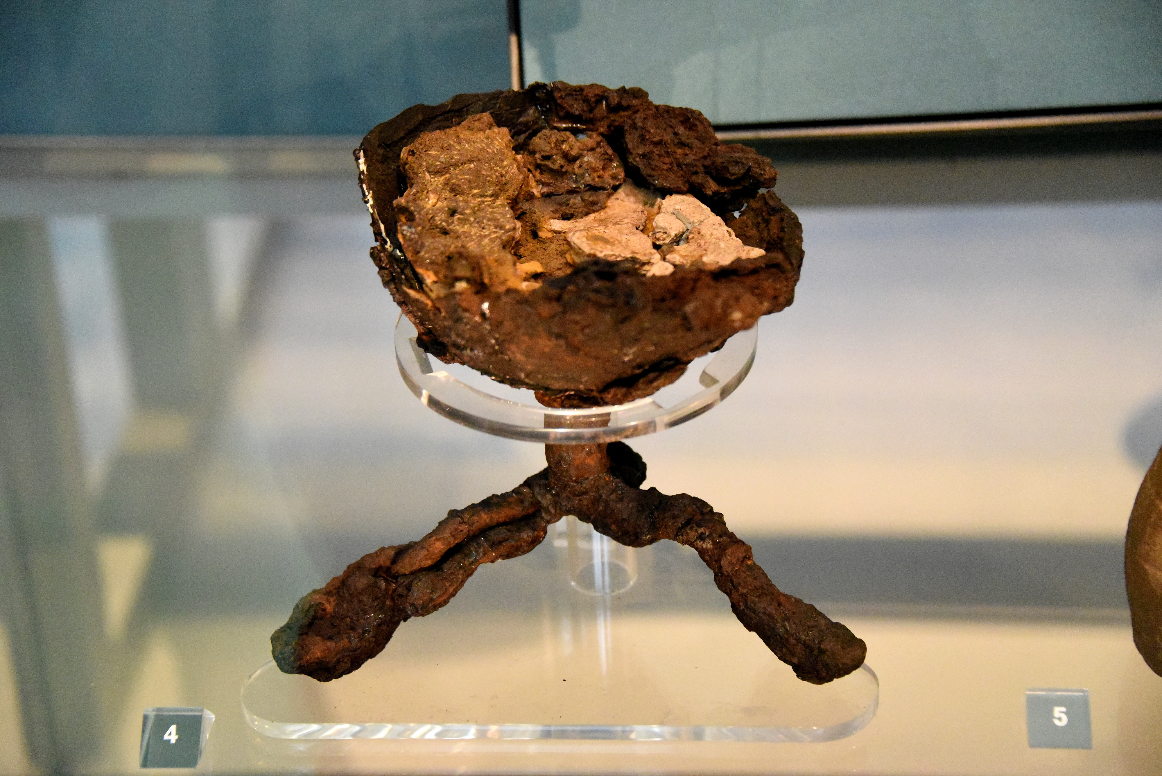 This iron lamp, comprising a round bowl on a tripod foot, still contains the remains of beeswax fuel, but no trace of a wick has survived. Iron lamps are extremely rare finds from early Anglo-Saxon England. So far they have been only found in the richest burials like Bloomfield and Prittlewell in Essex, as well as in Sutton Hoo. Early 600 CE. (The British Museum, London)