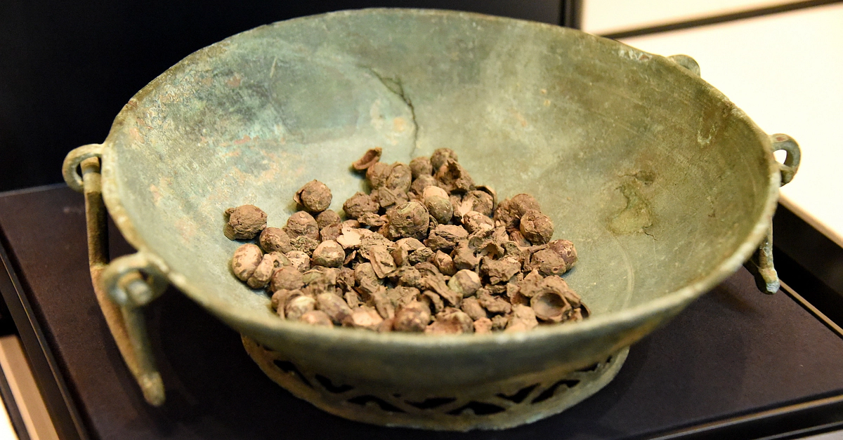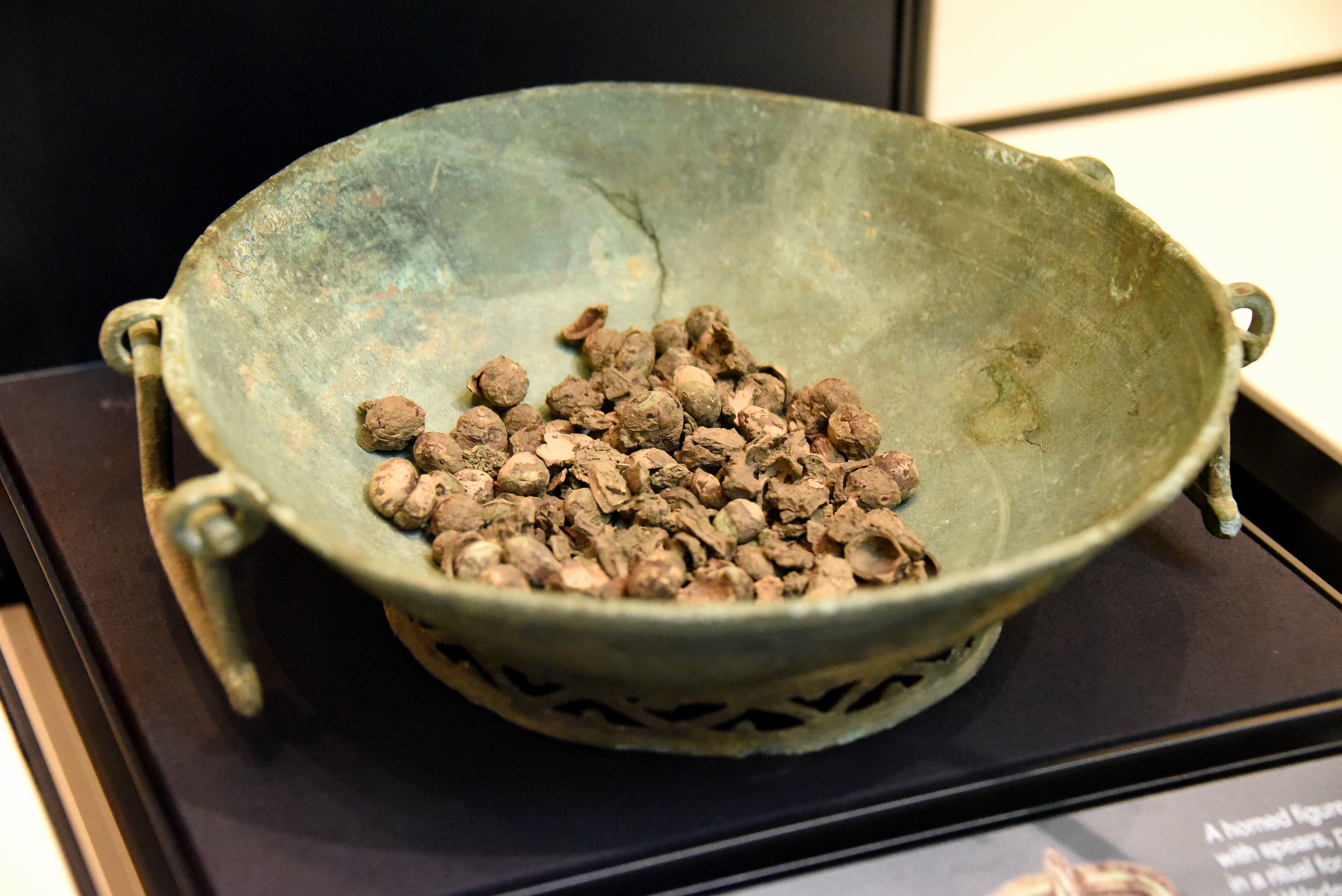 This large copper alloy bowl is filled with hazelnuts. It had been placed in a burial, perhaps as a symbolic offering or provision for the dead from the mourners who set out the grave. This vessel and its contents provides a glimpse into Anglo-Saxon beliefs and burial rituals. From Great Chesterford, UK. Circa 500-600 CE. (The British Museum, London)