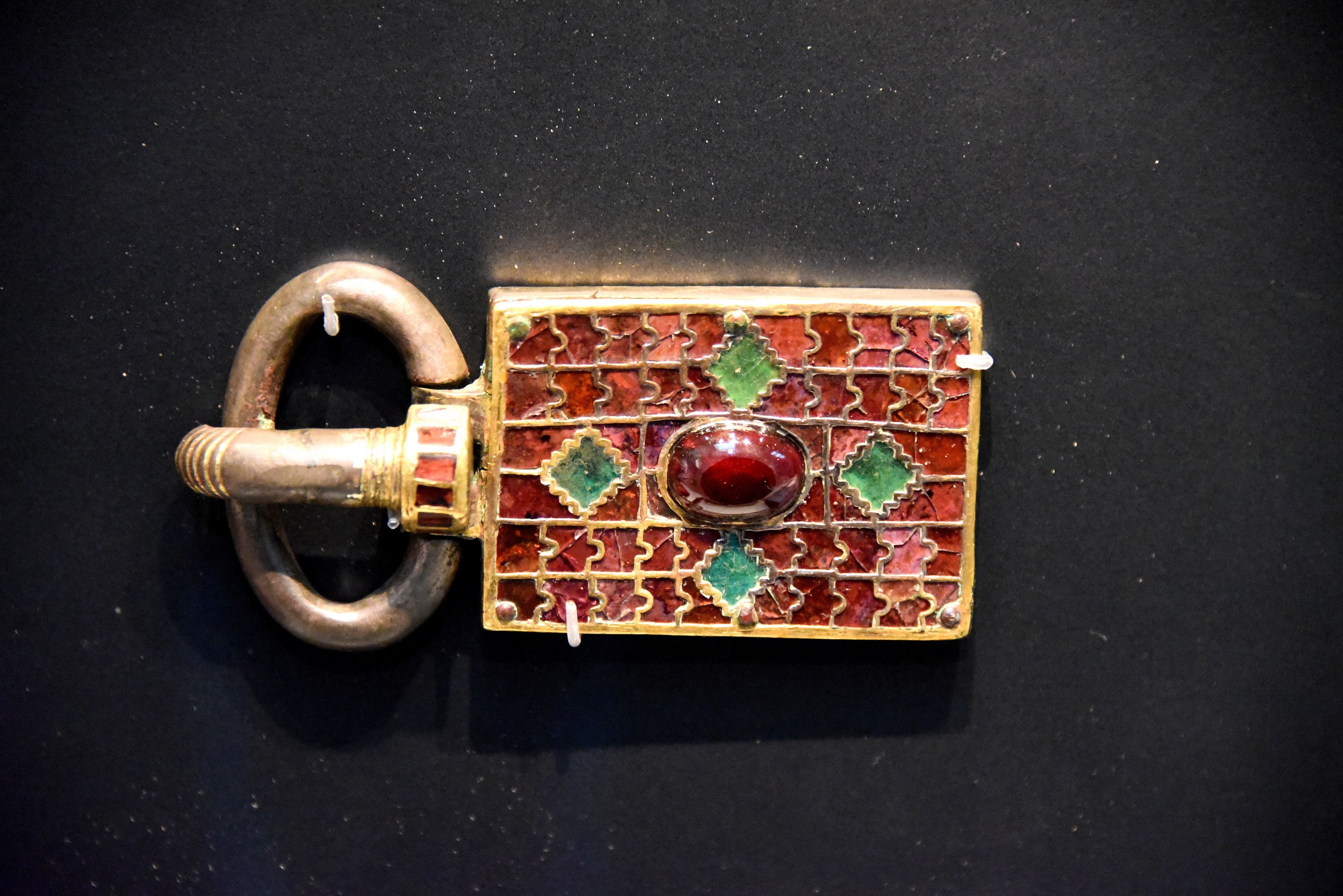 Ostrogothic buckle with inlaid green glass and garnet, possibly from Italy, c. 400s-650s.