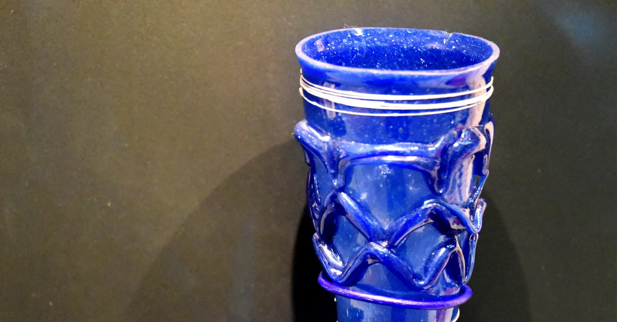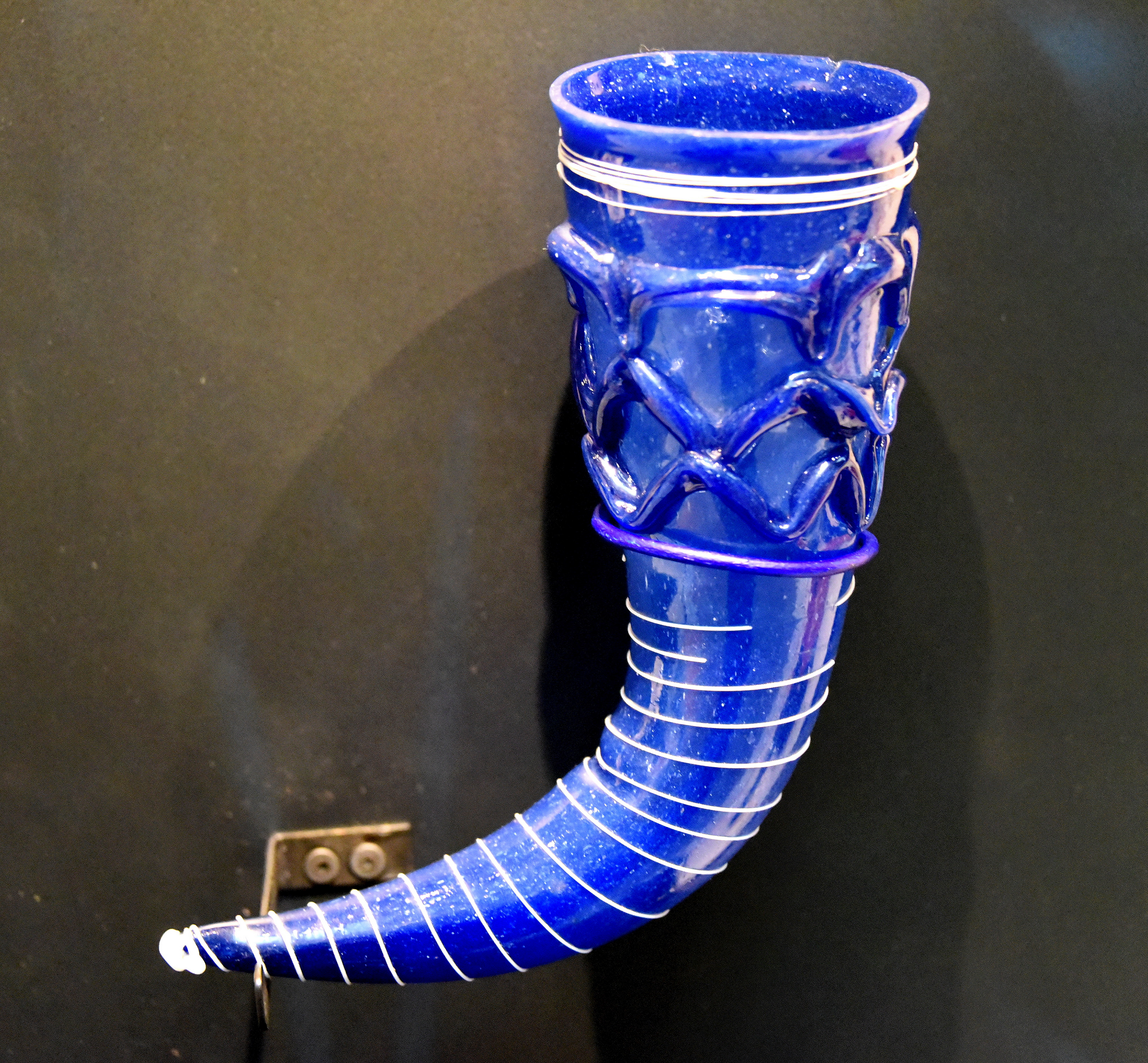 Drinking horns were popular with many Germanic cultures during this period, but this Lombard example from a high status grave in Sutri, Italy, is made from blue glass rather than the typical horn. It shows how the Lombards in Italy adapted Mediterranean techniques, such as colored glass, to suit their own tastes. Circa 500-700 CE. (The British Museum, London)