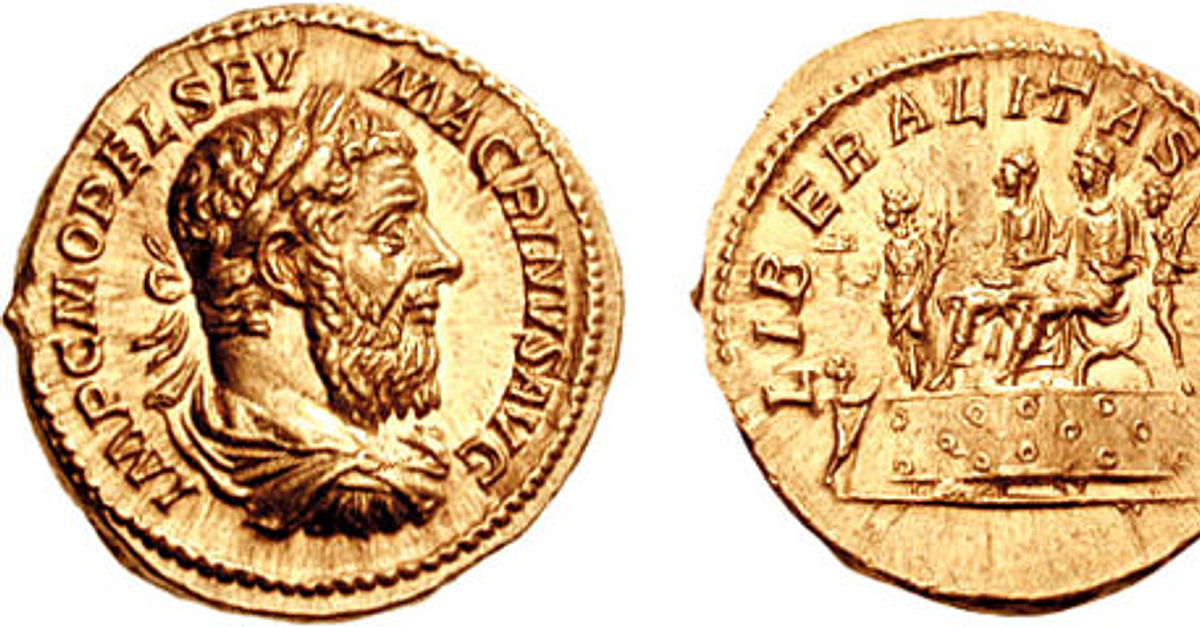 A gold aureus coin depicting Roman emperor Macrinus (r. 217-218 CE).