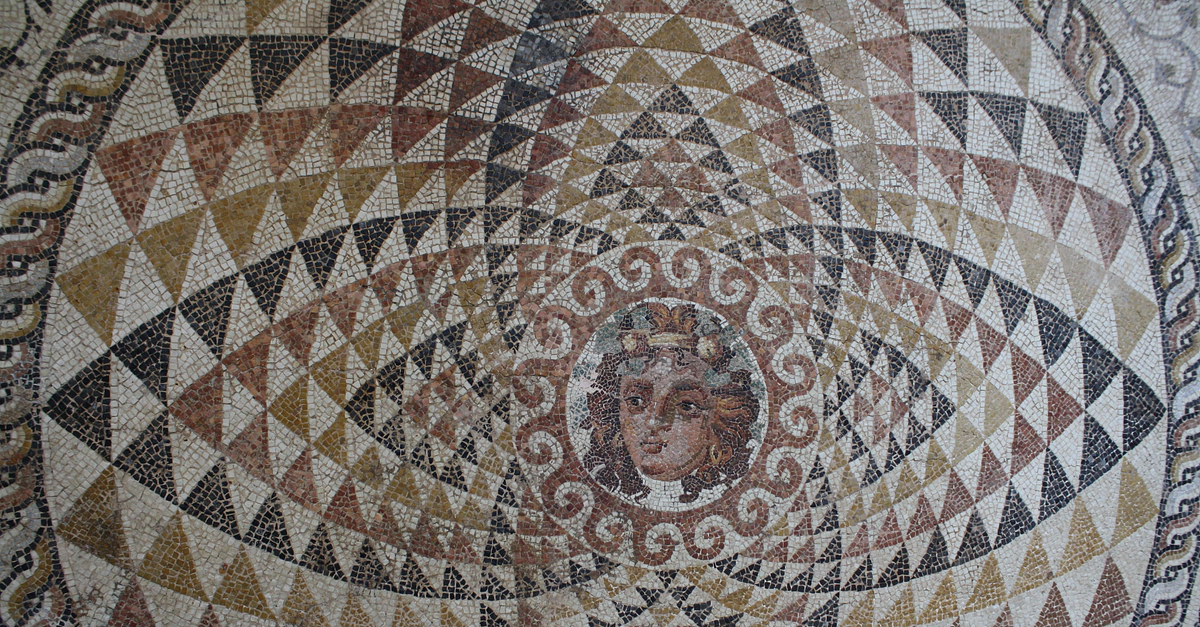 Central panel from tesselated floor of a Roman villa (second half 2nd Century BCE), Corinth. Depicted is Dionysos with fruit and ivy in his hair. Corinth Archaeological Museum.
