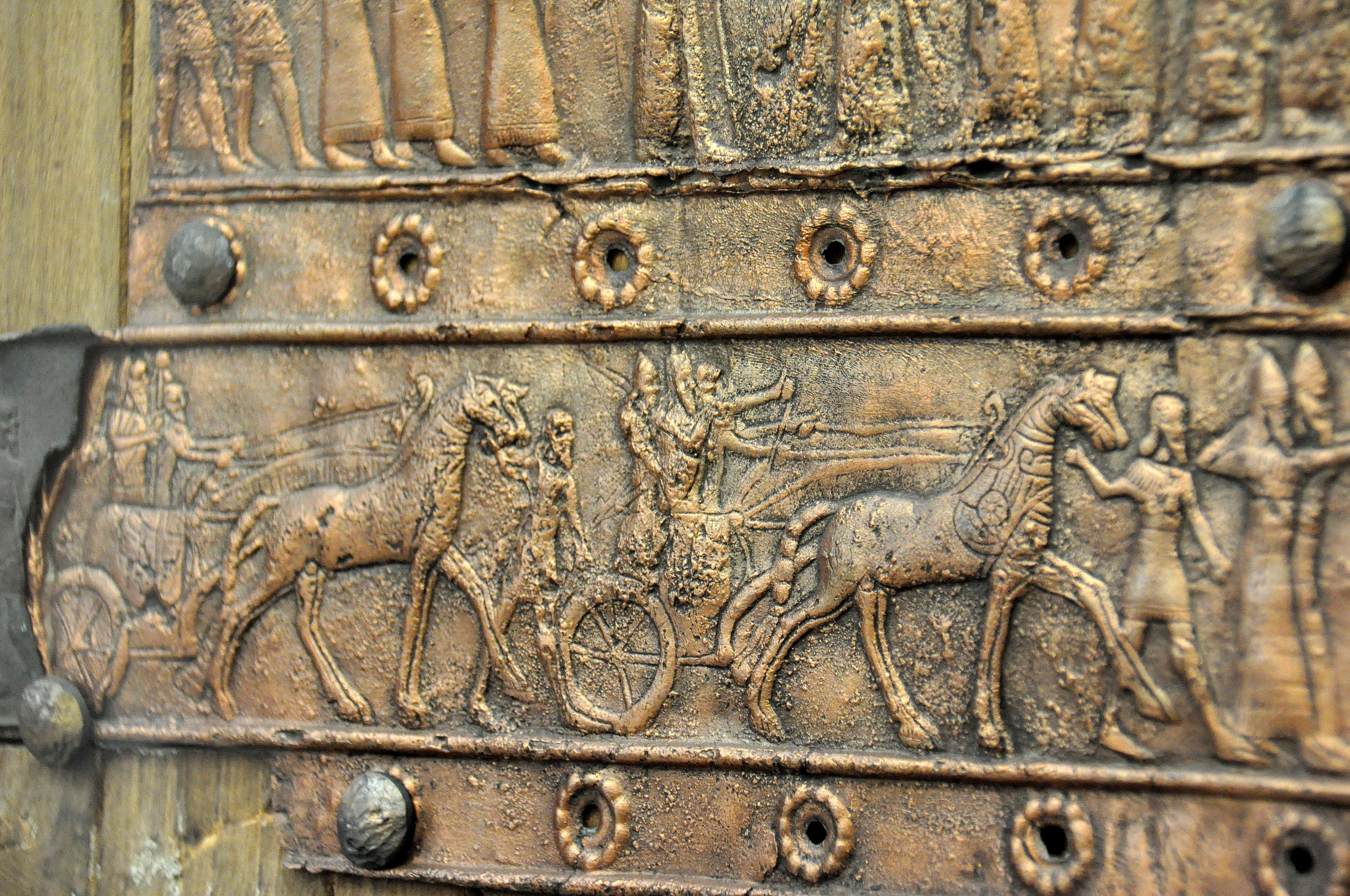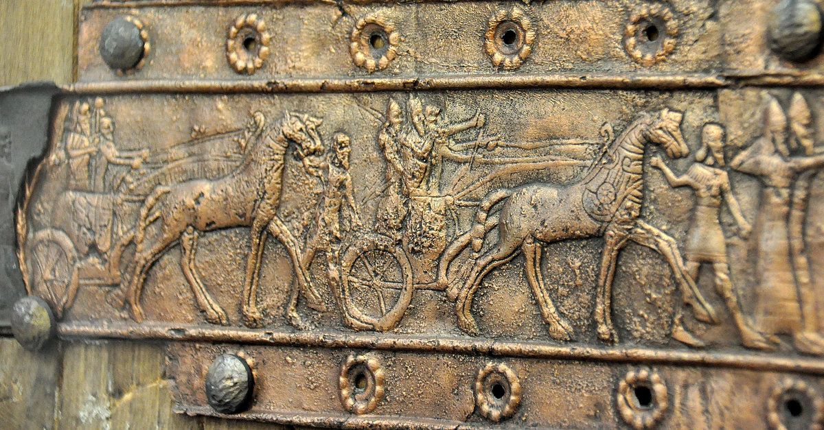 Detail of the bronze casing of the Balawat gate showing war chariots. From Balawat (Imgur-Enlil), northern Mesopotamia, Iraq. Neo-Assyrian Period, reign of King Shalmaneser III, 858-824 BCE. (Ancient Orient Museum/Istanbul Archaeological Museums, Istanbul, Turkey)