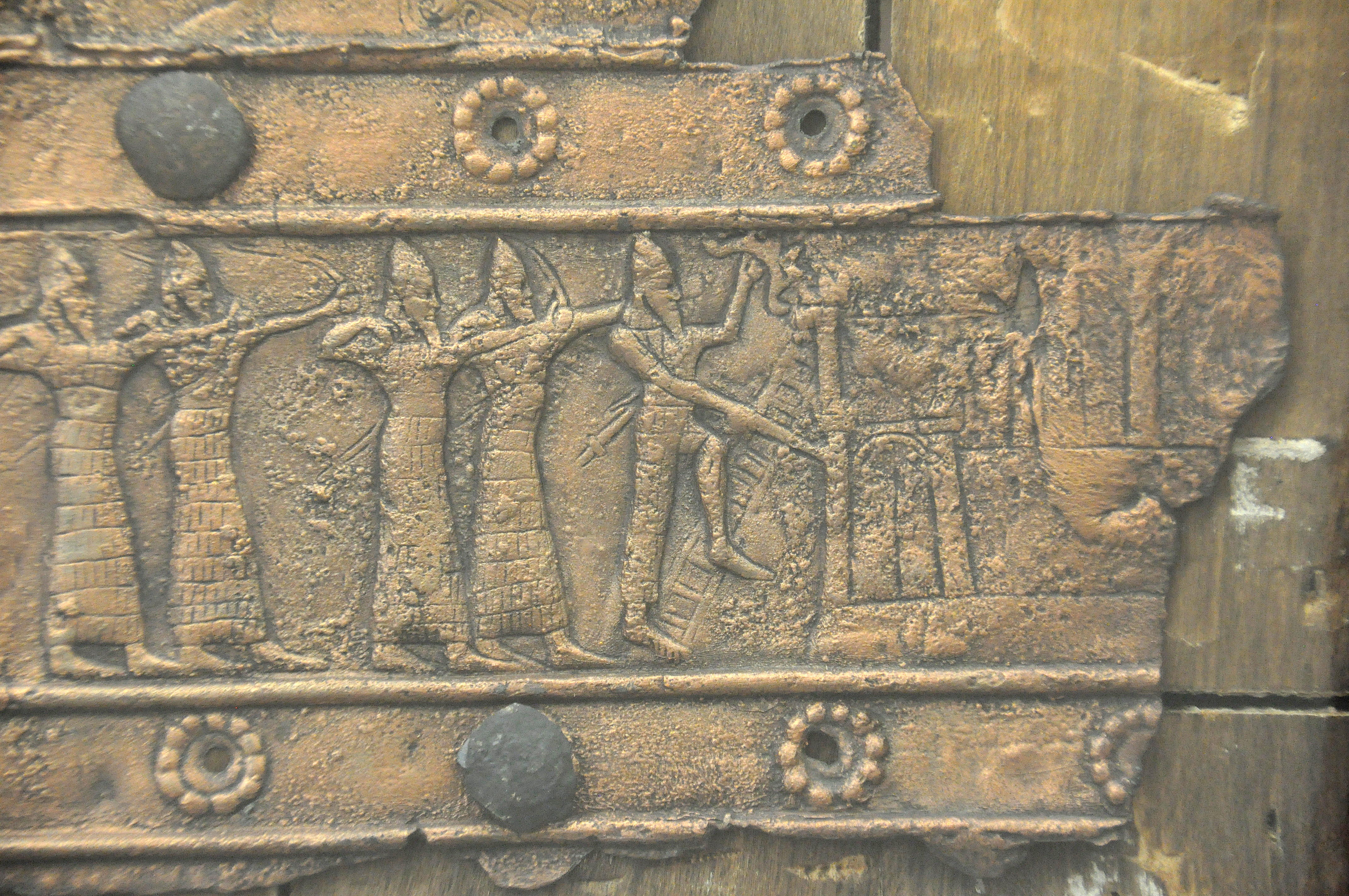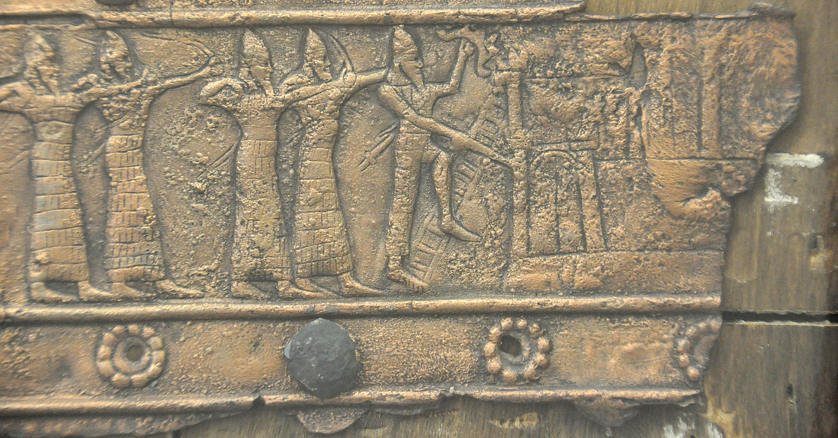 Detail of the bronze casing of the Balawat gate. From Balawat (Imgur-Enlil), northern Mesopotamia, Iraq. Neo-Assyrian Period, reign of King Shalmaneser III, 858-824 BCE. (Ancient Orient Museum/Istanbul Archaeological Museums, Istanbul, Turkey)