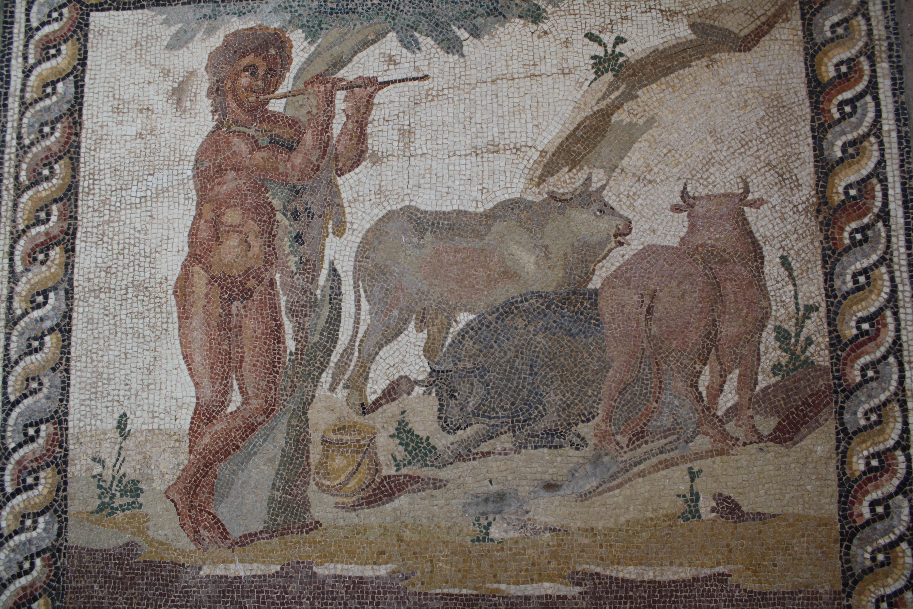 Tessellated mosaic from a Roman villa, Corinth. Depicted is a pastoral scene. (150-200 CE) Corinth Archaeological Museum.
