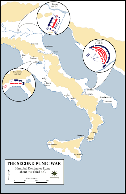 A map showing the location of three of the most important battles won by Carthaginian general Hannibal against Rome during the Second Punic War between 218 and 201 BCE. Lake Trasimene in June 217 BCE, Trebia River in December 218 BCE, and Cannae in August 216 BCE. (The Department of History, United States Military Academy)