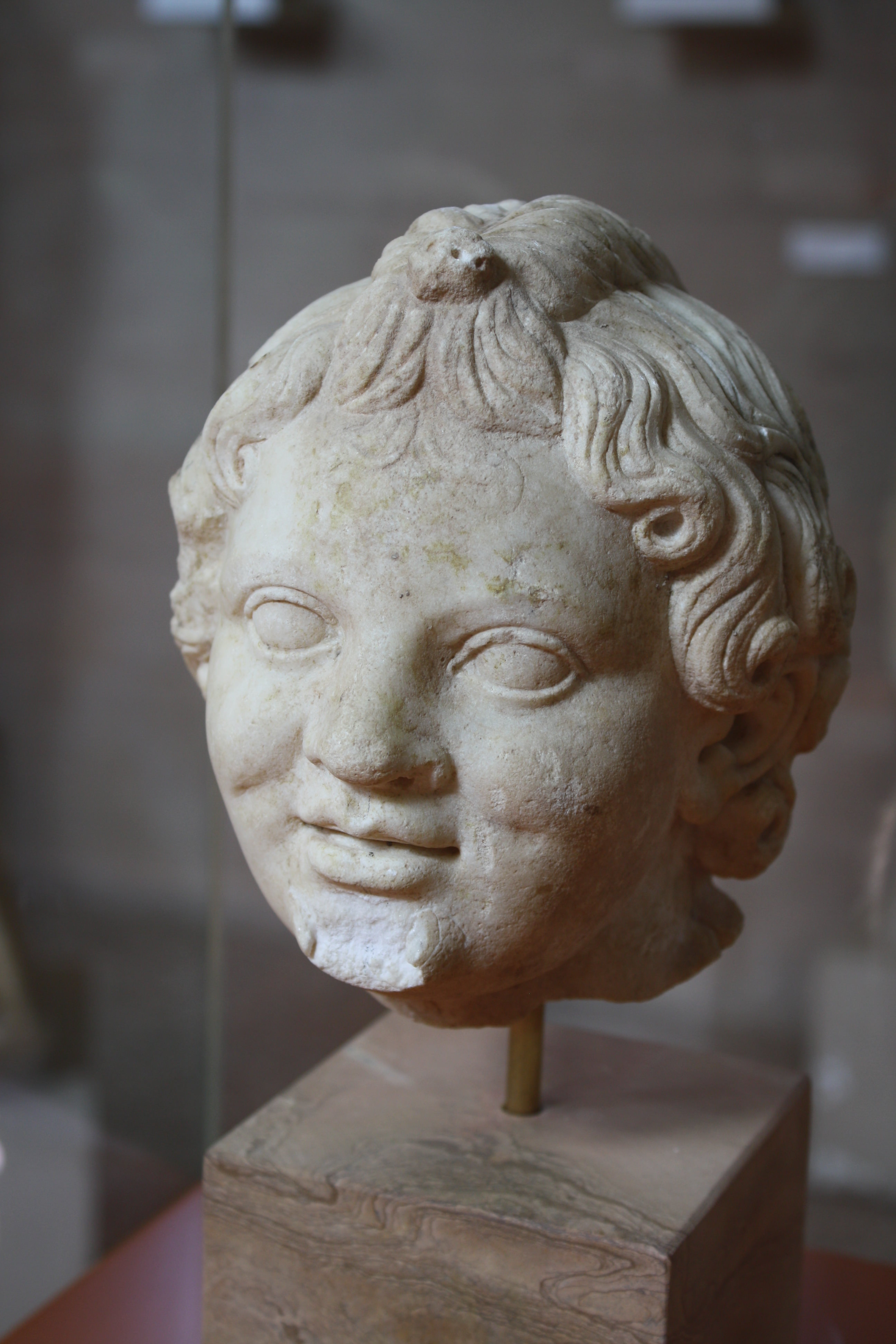 Marble head of Cupid (Eros), 1st-2nd century CE. Discovered in the Forum of Ancient Corinth. (Corinth Archaeological Museum Corinth).
