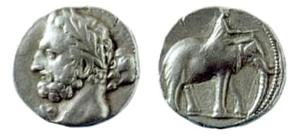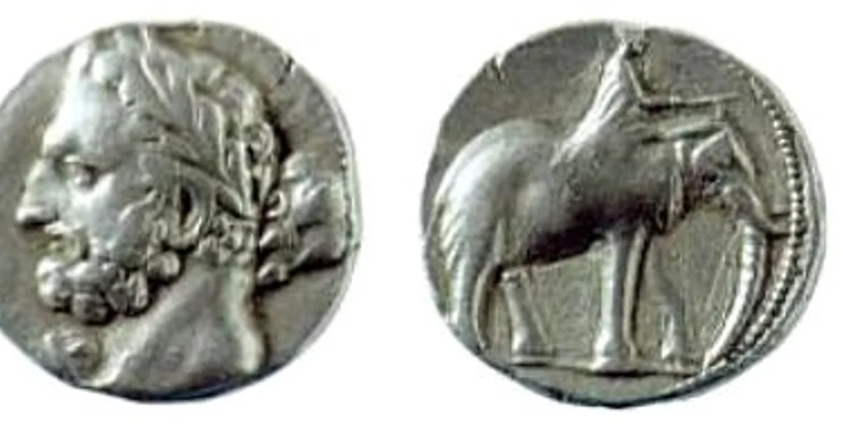 Carthaginian silver dishekel. The head has been identified as Hamilcar Barca (c. 285 – c. 228 BCE). Minted in Carthago Nova, Spain, 237-227 BCE.