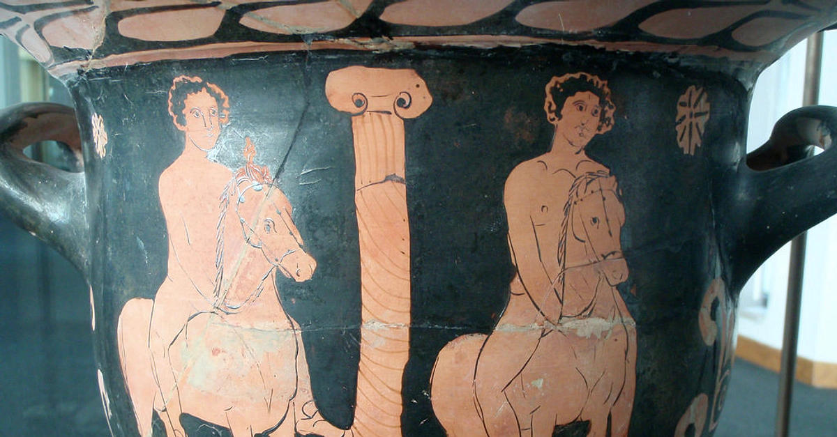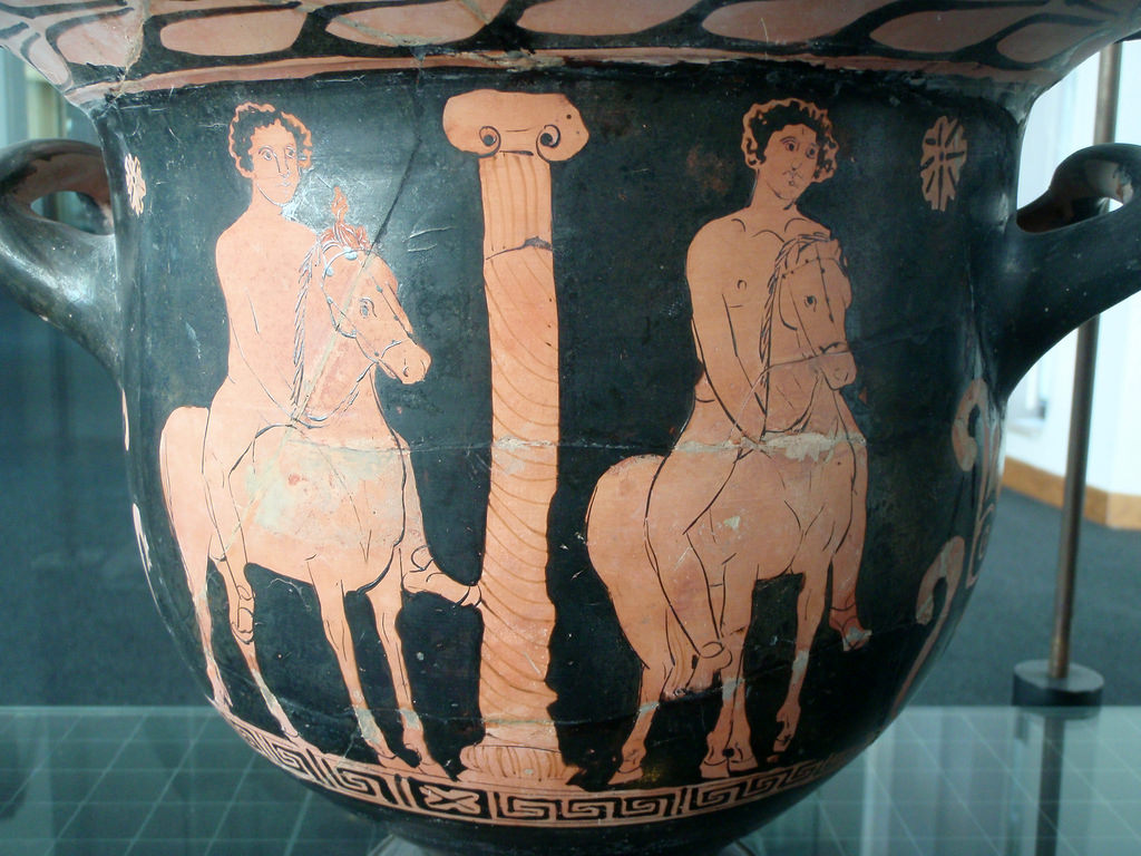 A red-figure vase possibly depicting Castor and Pollux (the Dioscuri), the hero twins of Greek mythology. 420-400 BCE, Lucanian. (Museo Provinciale Archeologico 'S. Castromediano,' Lecce, Italy)