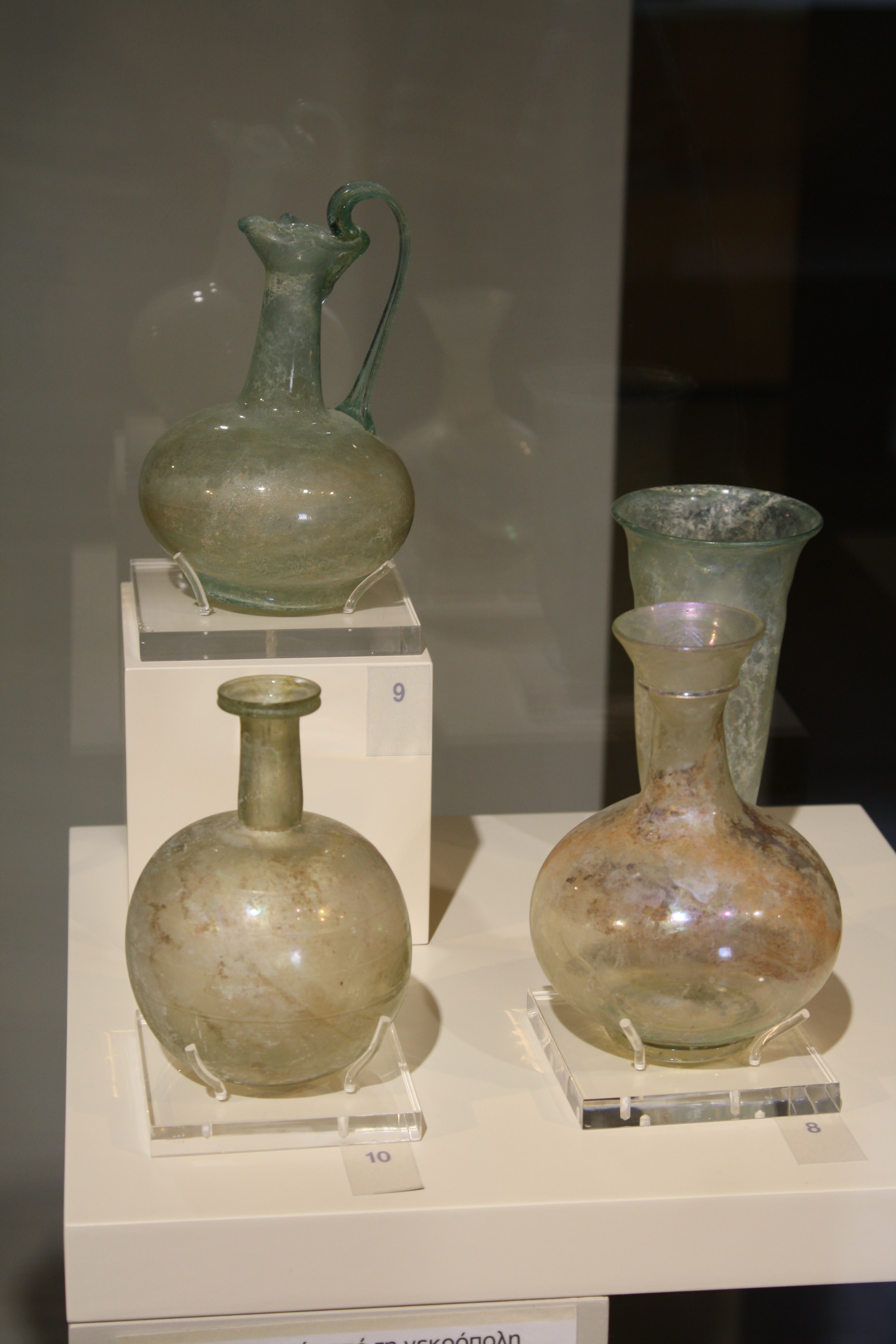 Glass vases from the necropolis of Epidaurus and Arkadiko, 1st century CE. Nafplio Archaeological Museum.