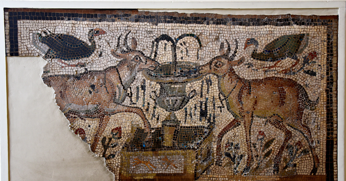 Tame deer drinking from an ornate fountain; this scene became popular in Early Christian art as symbolizing the fountain of life. From Carthage, modern-day Tunisia. 4th or 5th century CE. (The British Museum, London)
