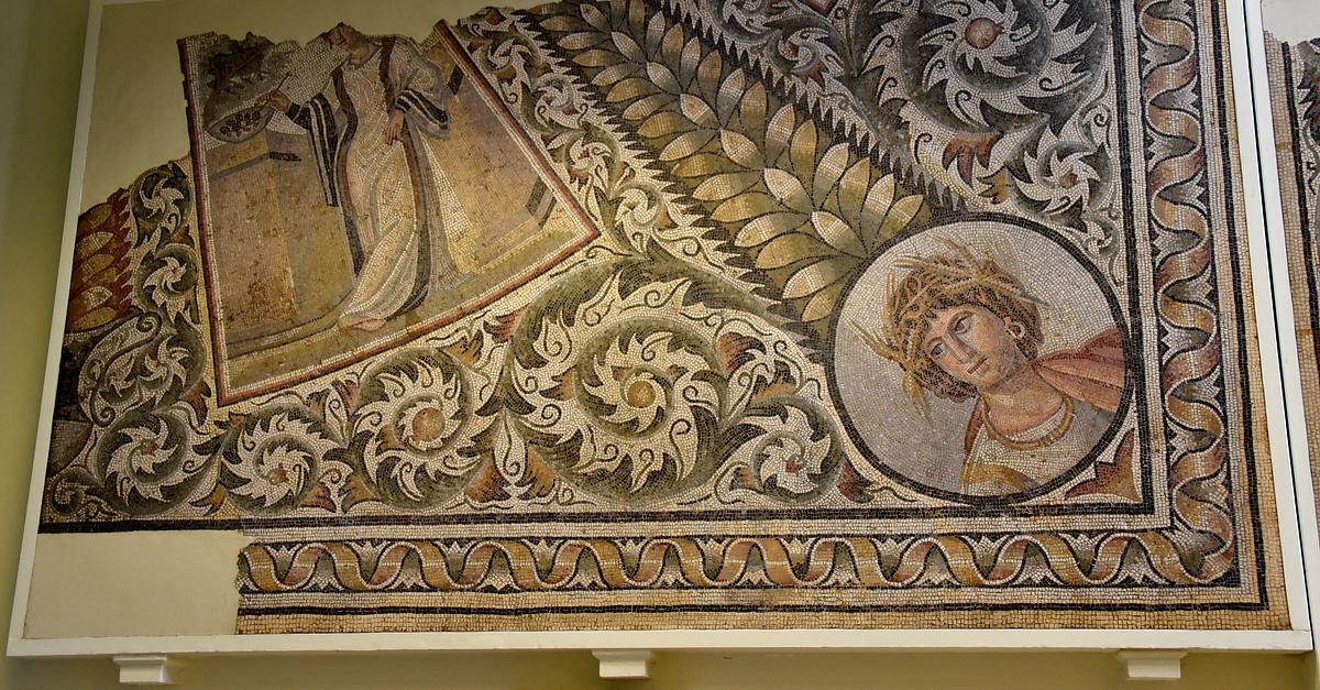 Part of a segment of floor mosaic depicting July and a corner medallion of Summer wreathed with ears of corn. The figure of July stands picking mulberries from a glass bowl. From Carthage, modern-day Tunisia. Second half of the 4th century CE. (The British Museum, London)