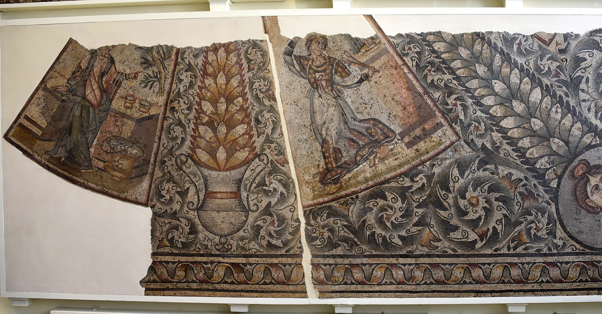 The figure of March on this fragment of floor mosaic stands pointing at a swallow in a tree behind an altar. April holds a pair of castanets, dancing in front of an altar of Venus. From Carthage, modern-day Tunisia. Second half of the 4th century CE. (The British Museum, London)