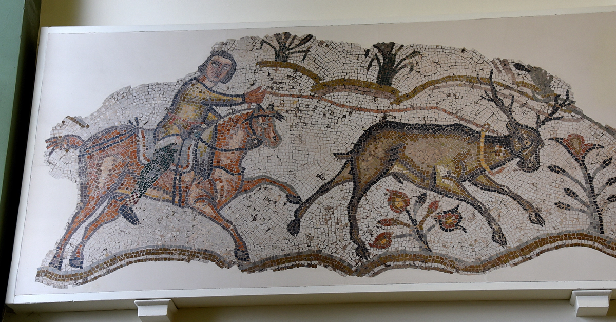 This hunting scene from a mosaic pavement shows a horseman roping a stag. The pavement is one of a common North African type, depicting a favorite pastime of wealthy landowners. Since the horseman wears a Germanic dress, he has been identified as a member of the Vandal ruling class. From Carthage, modern-day Tunisia. Late 5th or 6th century CE. (The British Museum, London)