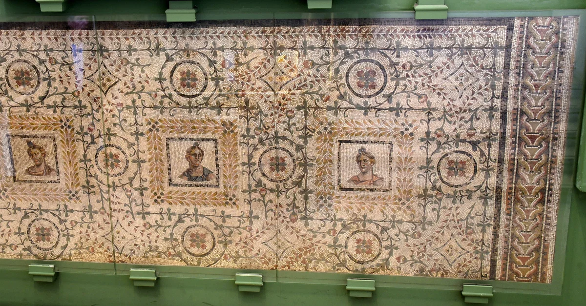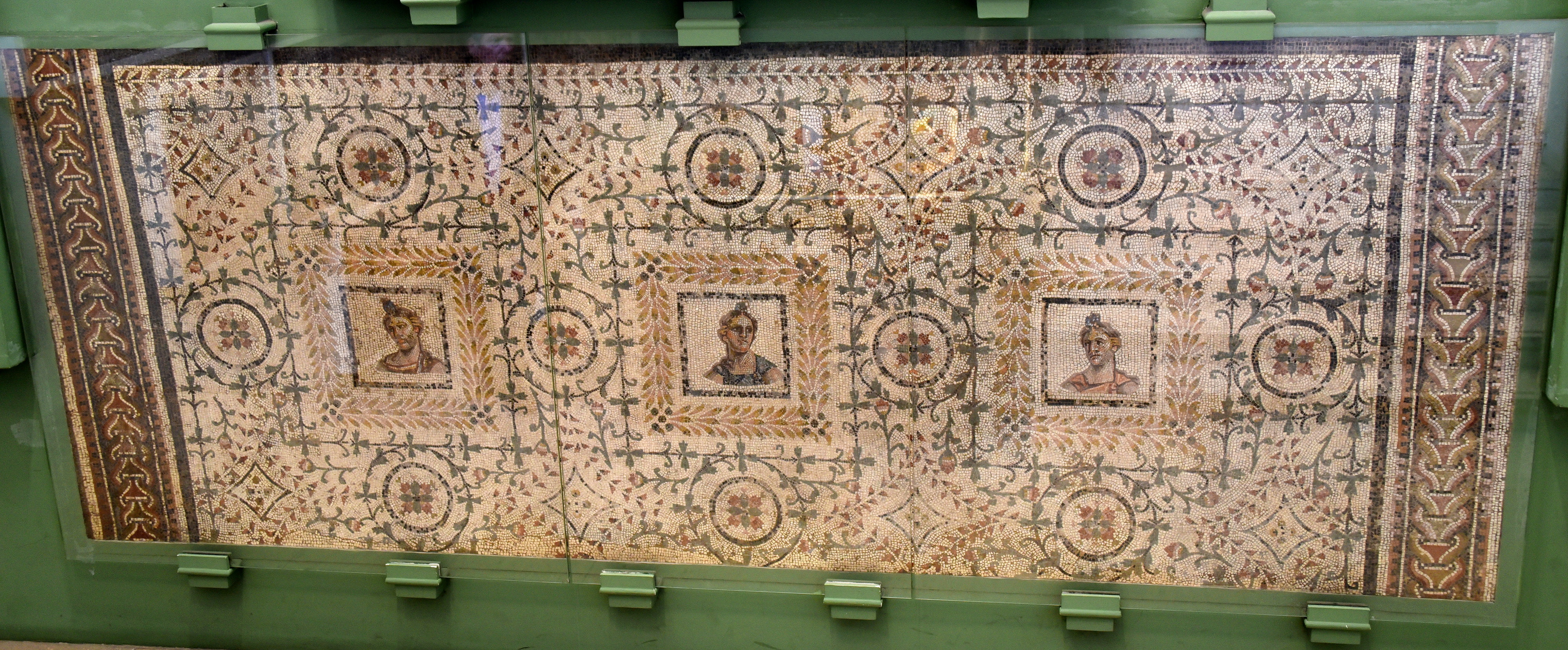 Floral trellis pattern mosaic with busts of the seasons in wreathed squares. From Carthage, modern-day Tunisia. Mid-2nd century CE. (The British Museum, London)