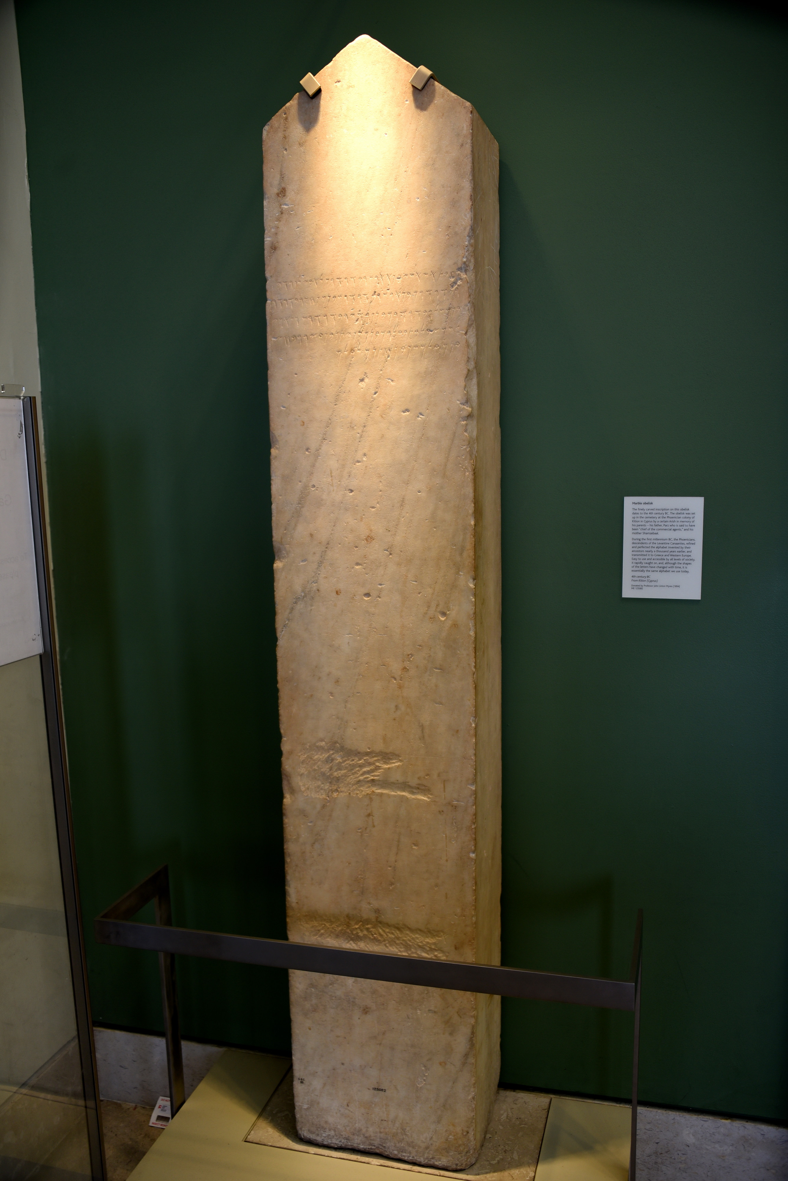 The finely carved inscription on this obelisk dates to the 4th century BCE. The obelisk was set up in a cemetery at the Phoenician colony of Kition in Cyprus by a certain Arish in memory of his parent; his father Parz, who is said to have been "chief of the commercial agents", and his mother Shamzabaal. During the 1st millennium BCE, the Phoenicians, descendants of the Levantine Canaanites, refined and perfected the alphabet invented by their ancestors nearly a thousand years earlier, and transmitted to Greece and Western Europe. Easy to use and accessible to all levels of society, it rapidly caught on, and, although the shapes of the letters have changed with time, it is essentially the same alphabet we use today. From Kition, Cyprus. 4th century BCE. The British Museum, London.