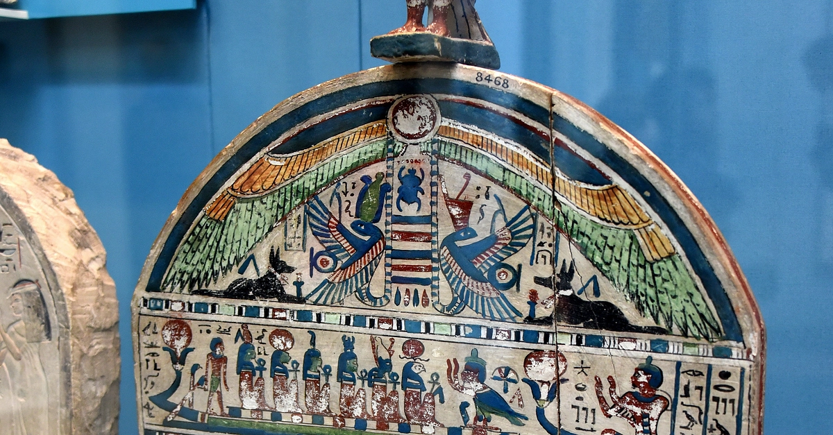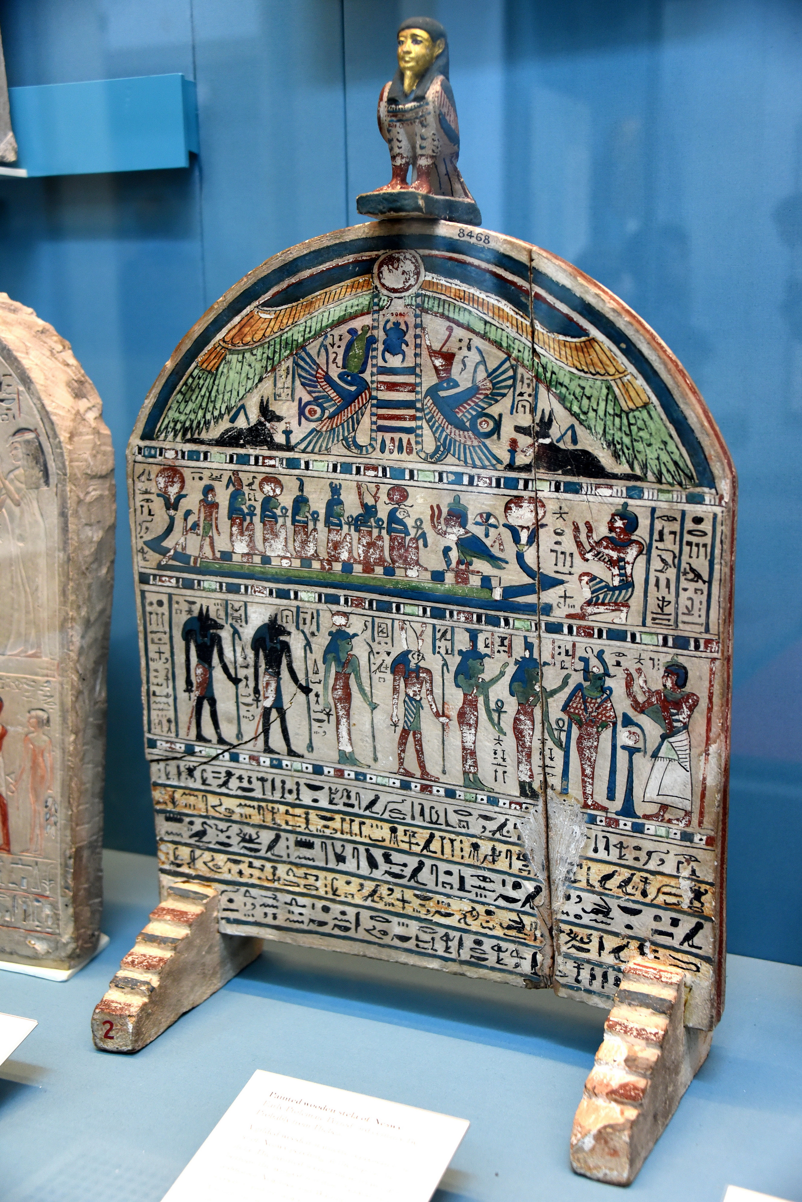 The gilded wooden statuette represents the "Ba" of Neswy perching on the top of the stela. The painted scenes below, from top to bottom: the winged sun-disc flanked by goddesses Nekhbet and Wadjet as serpents, and by jackals representing Anubis; the deceased adoring the sun-god and other deities in the solar barque; and the deceased before Osiris, Isis, Nephthys, Horus, Hathor, Anubis, and Wepwawet. Probably from Thebes, Egypt. Early Ptolemaic Period, 3rd century BCE. (The British Museum, London)