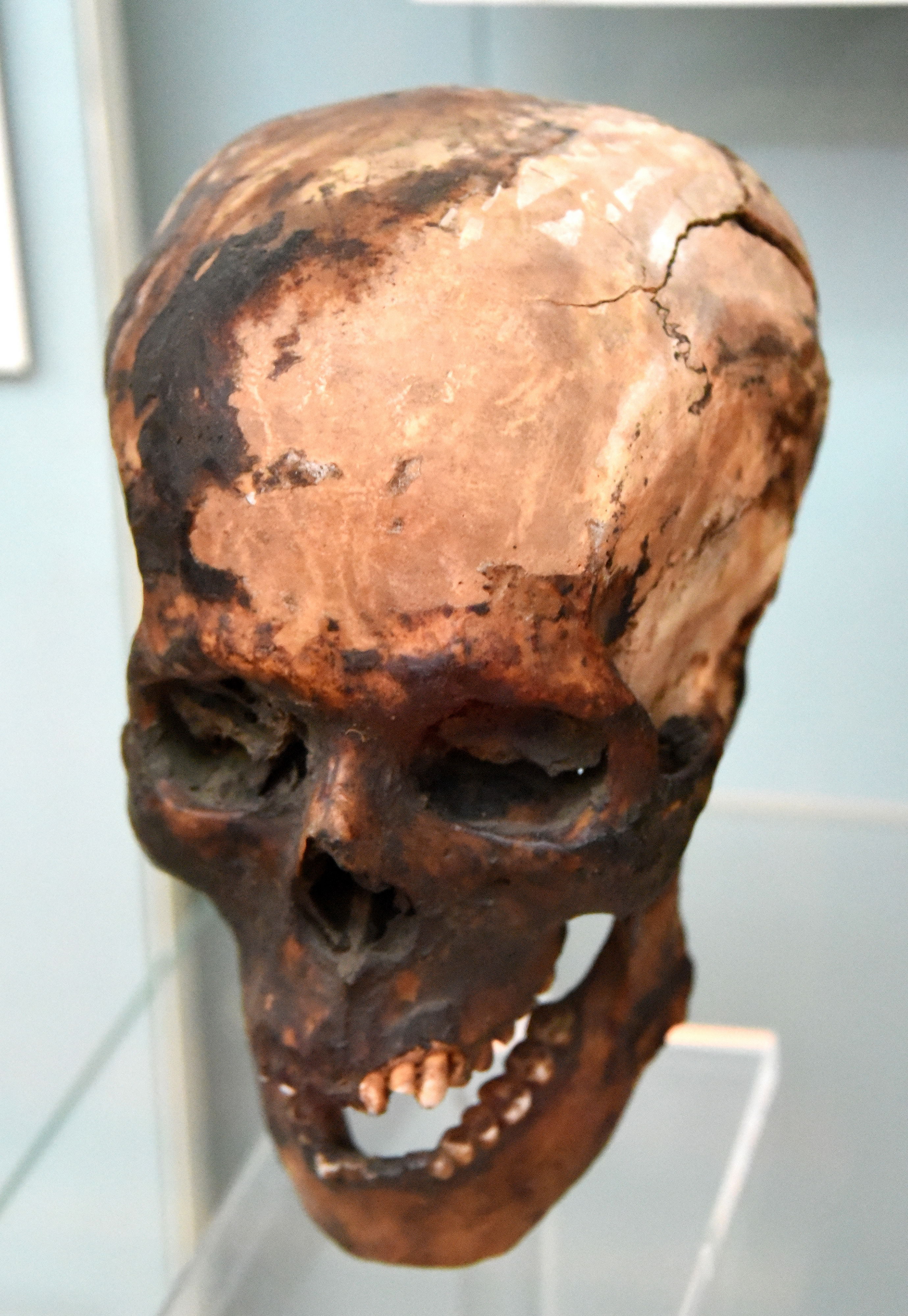 The skull of this middle-aged man shows clear dental attrition (wear of the biting surfaces of the teeth). The injury to the left parietal bone may have occured after death. From Sedment, Egypt. 6th Dynasty, circa 2345-2181 BCE. The British Museum, London.
