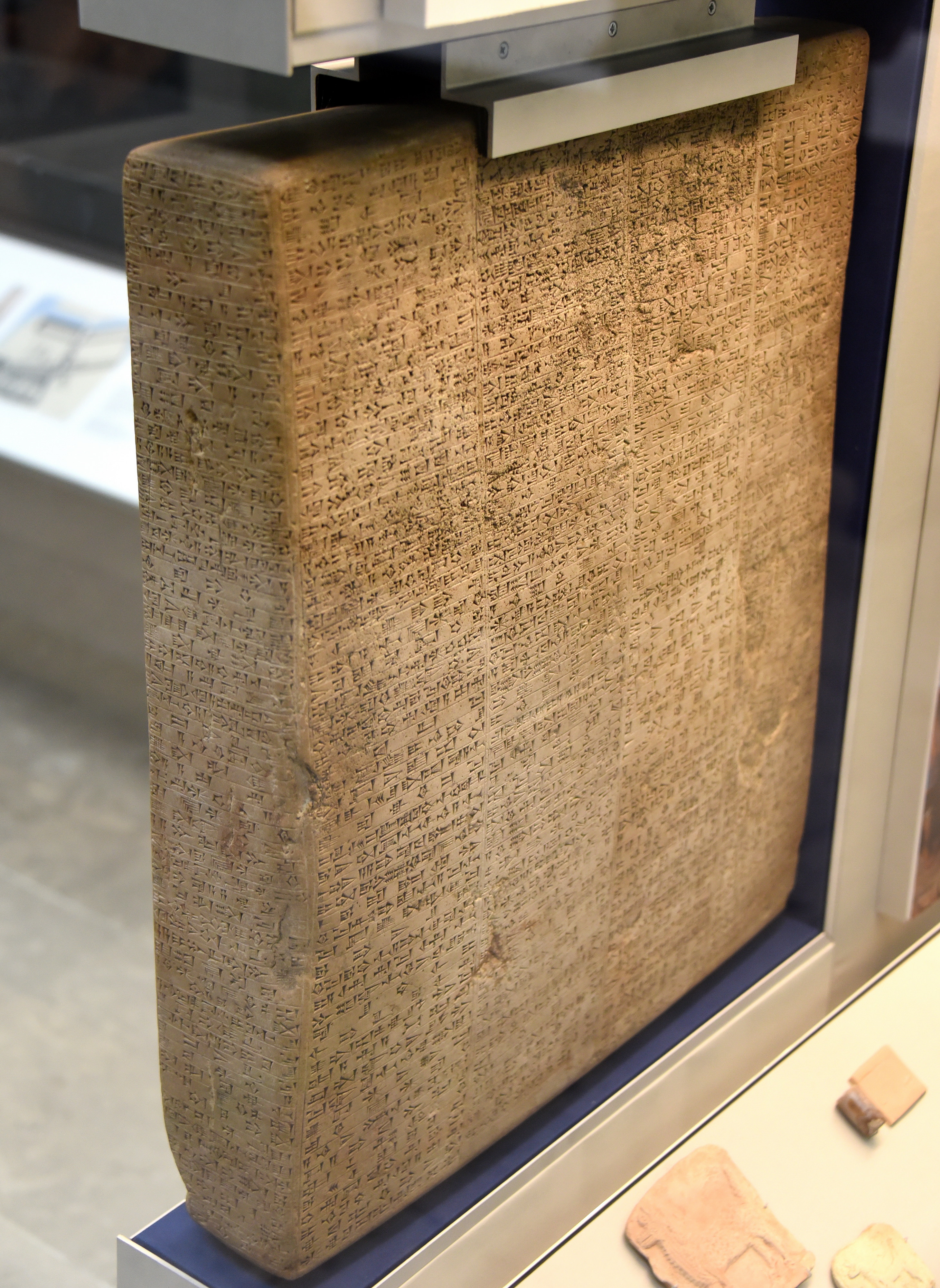 Building Babylon: this inscribed stone was found at the ruins of Babylon and described the religious devotion and civic achievement of king Nebuchadnezzar II. The long inscription records that as well as building the Processional Way and the Ishtar Gate, the king decorated chapels and restored equipment for the new year celebrations, such as the processional boat for the god Marduk. He also rebuilt temples and improved city walls. It was found before 1803 CE and was given to the Museum of the East India House From Babylon, southern Mesopotamia, Iraq. Neo-Babylonian Period, reign of king Nebuchadnezzar II, 605-552 BCE. (The British Museum, London)