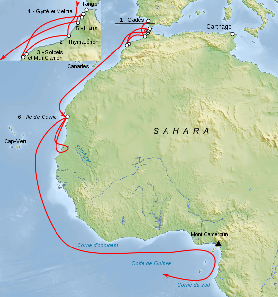 A map indicating the possible route of Hanno, a Carthaginian who led a colonising and exploration expedition down the Atlantic coast of Africa in the 6th or 5th century BCE. Some scholars suggest he reached modern Sierra Leone, others that he went as far south as the Cameroons or Gabon.