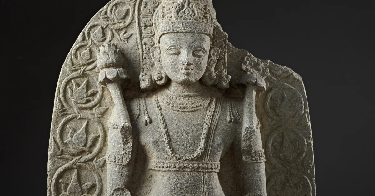 A sculpture of the Hindu sun-god Surya. The god is in a typical pose holding lotus flowers. Karnataka or Andhra Pradesh, India, c. 1100-1150 CE. (Los Angeles County Museum of Art)