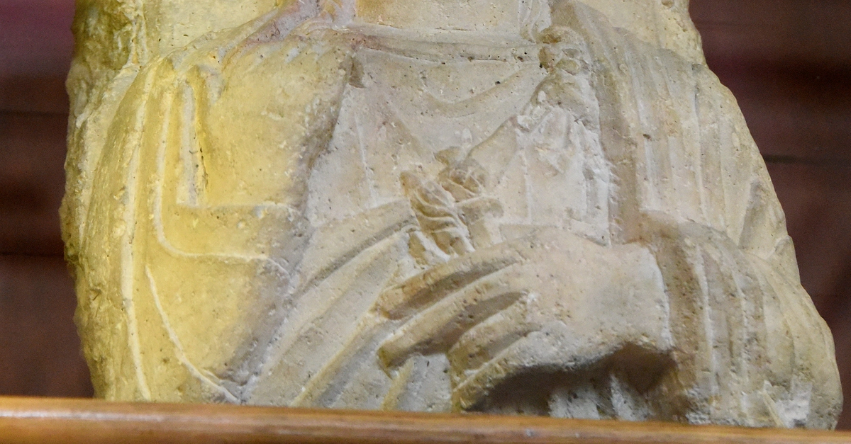 The Aramaic inscription on this limestone bust of a woman reads "Attai daughter of El'a". The woman wears a Greek chiton, From a funerary relief at Palmyra, modern-day Homs Governorate, Syria. Circa 50-150 CE. (The British Museum, London)