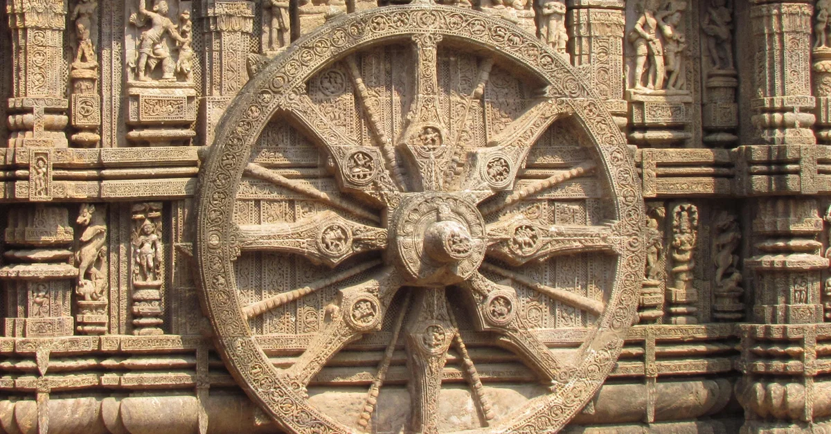 Carving of a wheel on the 13th century CE Konarak Sun Temple (Konrak), Orissa, India. The temple was dedicated to the sun god Surya. There are a total of 12 pairs of wheels and the main shrine is shaped like a chariot and the wheels represent time. In fact, they can each be used as sundials to read time.