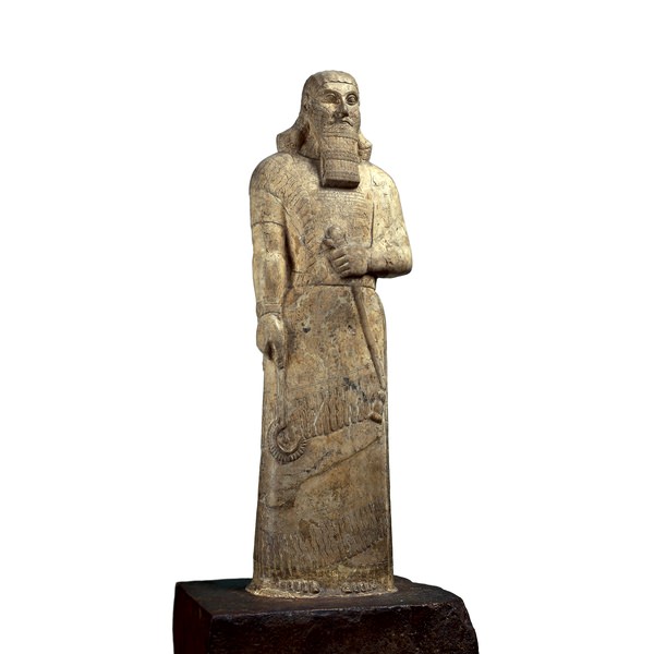 This statue of King Ashurnasirpal II (883-859 BCE) was placed in the Temple of Ishtar Sharrat-niphi. It was designed to remind the goddess Ishtar of the king's piety. It is made of magnesite and stands on a pedestal of a reddish stone. These unusual stones were probably brought back from a foreign campaign. Kings often boasted of the exotic things they acquired from abroad, not only raw materials and finished goods but also plants and animals.
