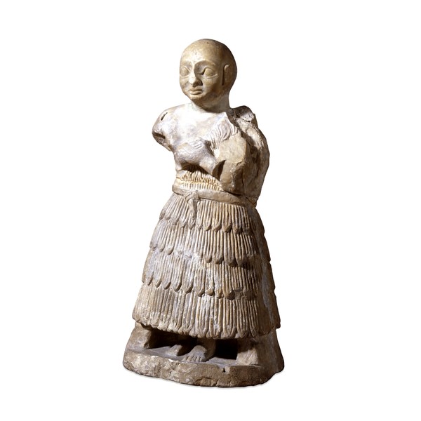 Provenance unknown, Mesopotamia Early Dynastic III period, about 2500-2200 BC A votive offering This gypsum statute was deposited in a temple to pray on behalf of the donor. It may have been set up in his lifetime or possibly as a memorial after his death. He wears a fleece skirt often referred to as a kaunakes. The statue was made at a time when southern Mesopotamia was politically fragmented between city-states, competing for control of farmland, water and trade. Where objects have not been excavated and their origin is unknown, it is often possible to date them by comparing them with dated examples. The style of votive figurines like this one can be shown to change through time. This one dates to a period known as Early Dynastic III.