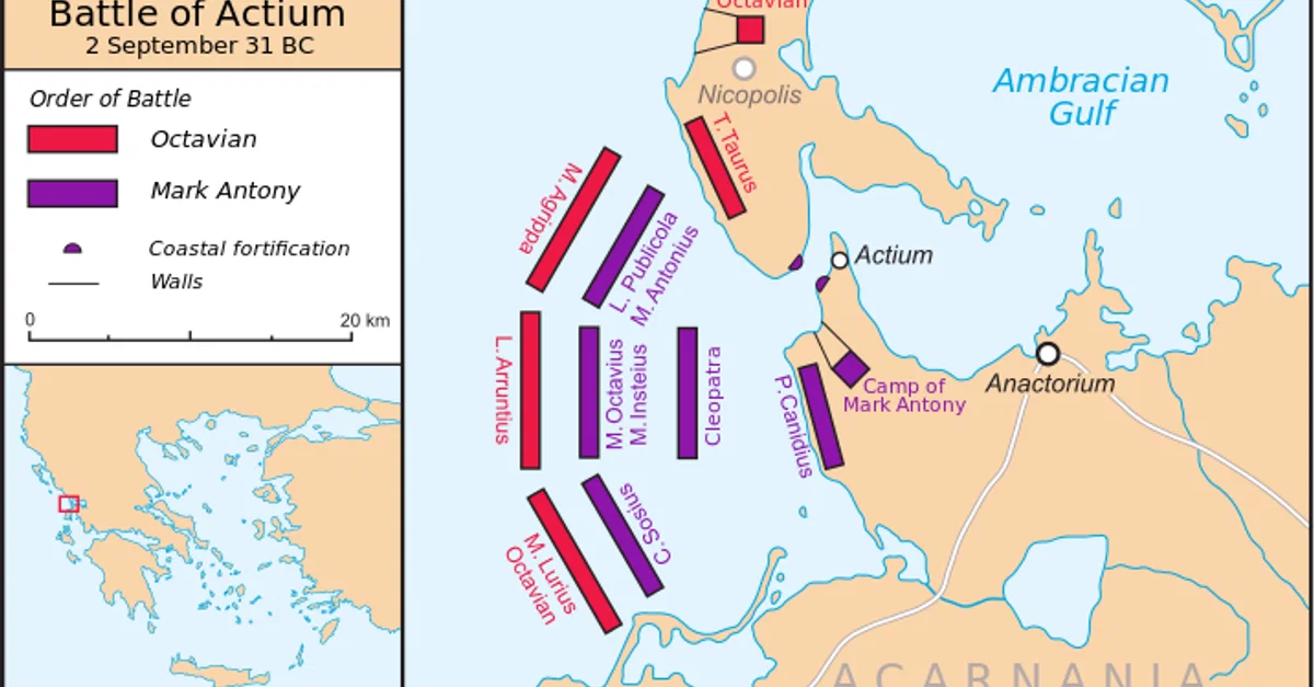 The positions of Octavian and Mark Antony at the Battle of Actium in 31 BCE.