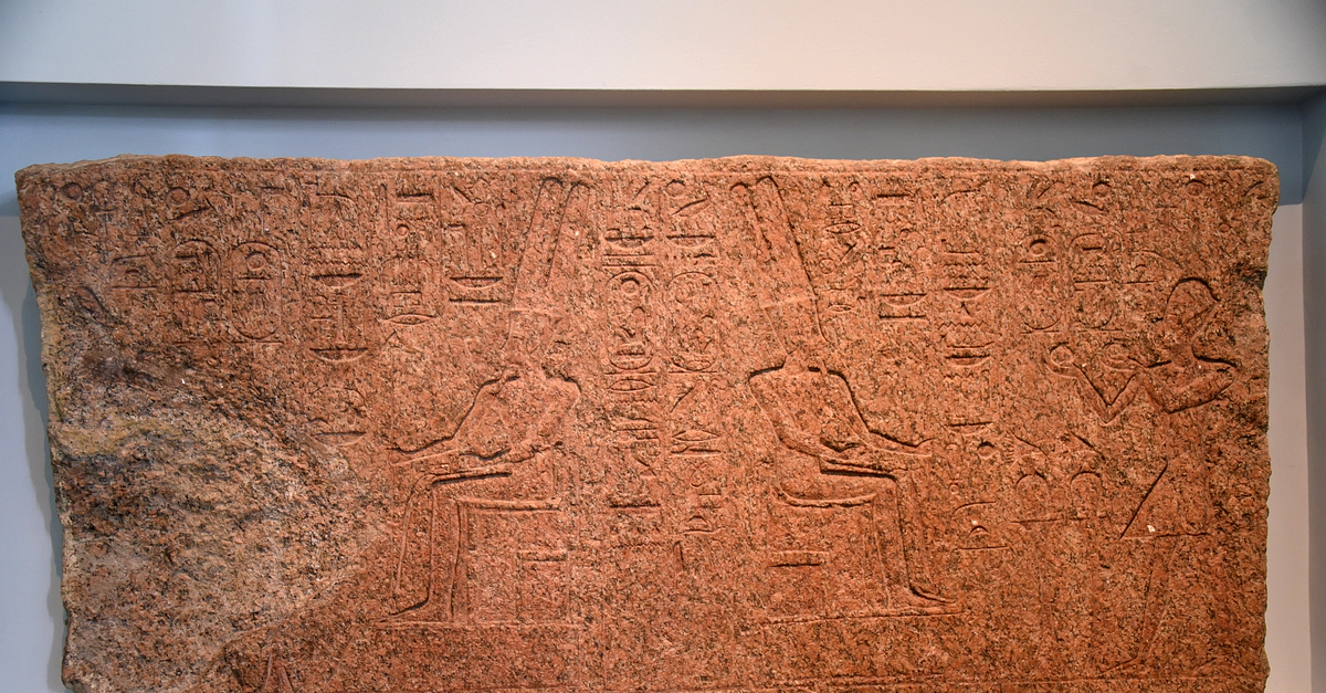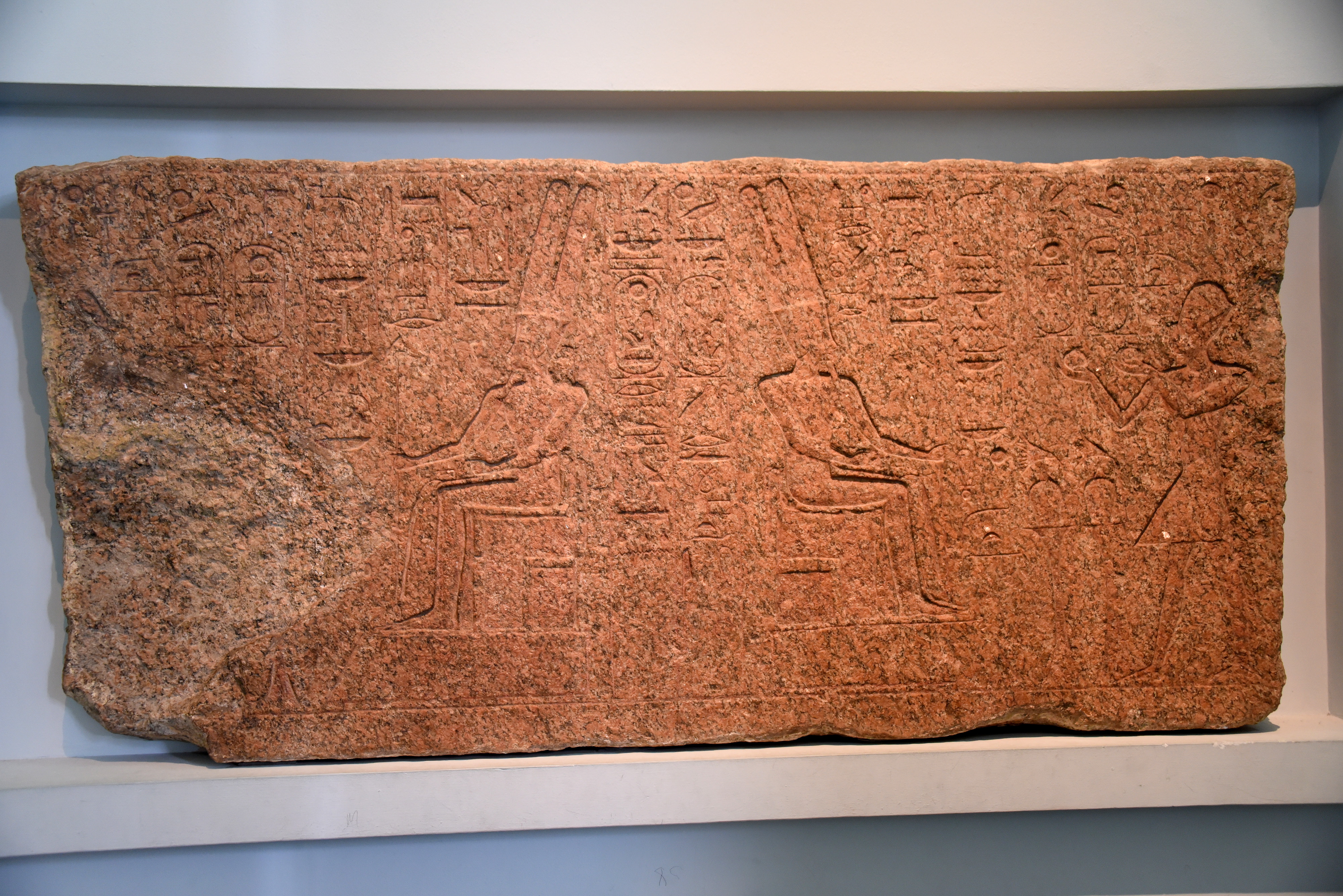 During the Amarna Period, King Akhenaten had the figures and name of the god erased. The damage was later repaired on the orders of King Seti I of the 19th Dynasty. The affected areas, if not the entire decoration, were recarved (with changes) on a slightly deeper surface. The restoration is mentioned in the hieroglyphic columns between the deity's seated figures.