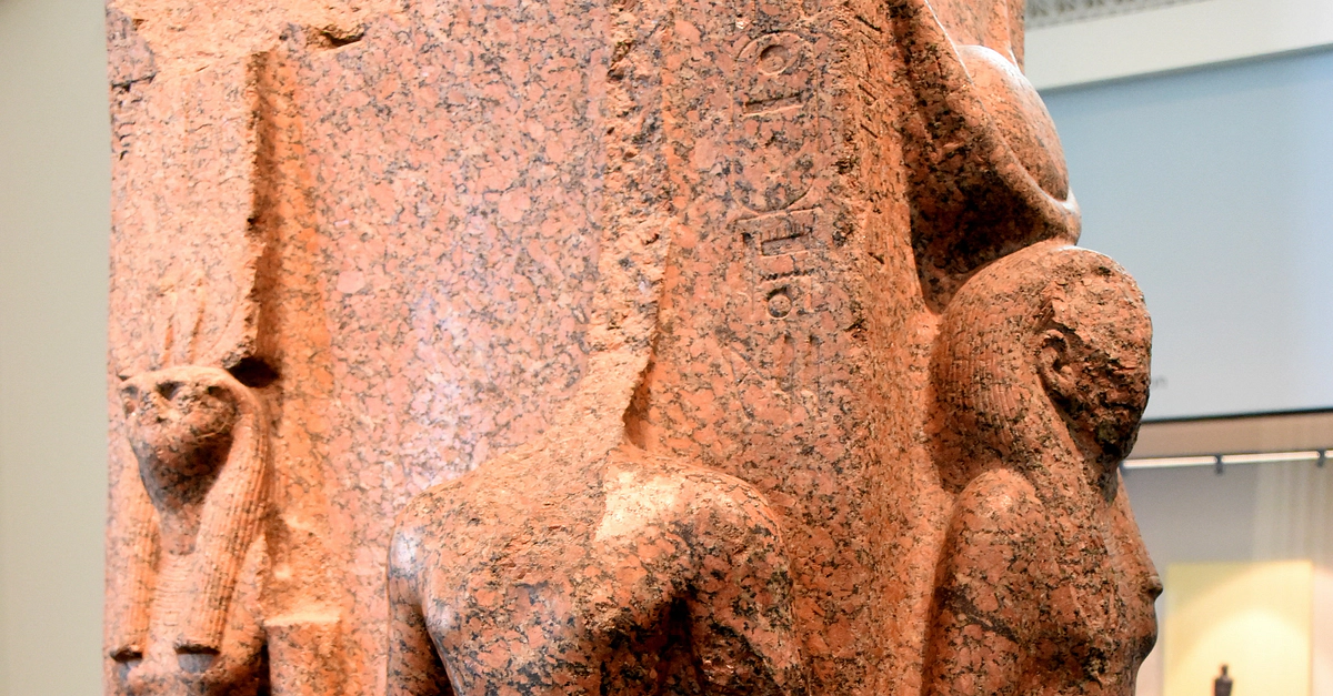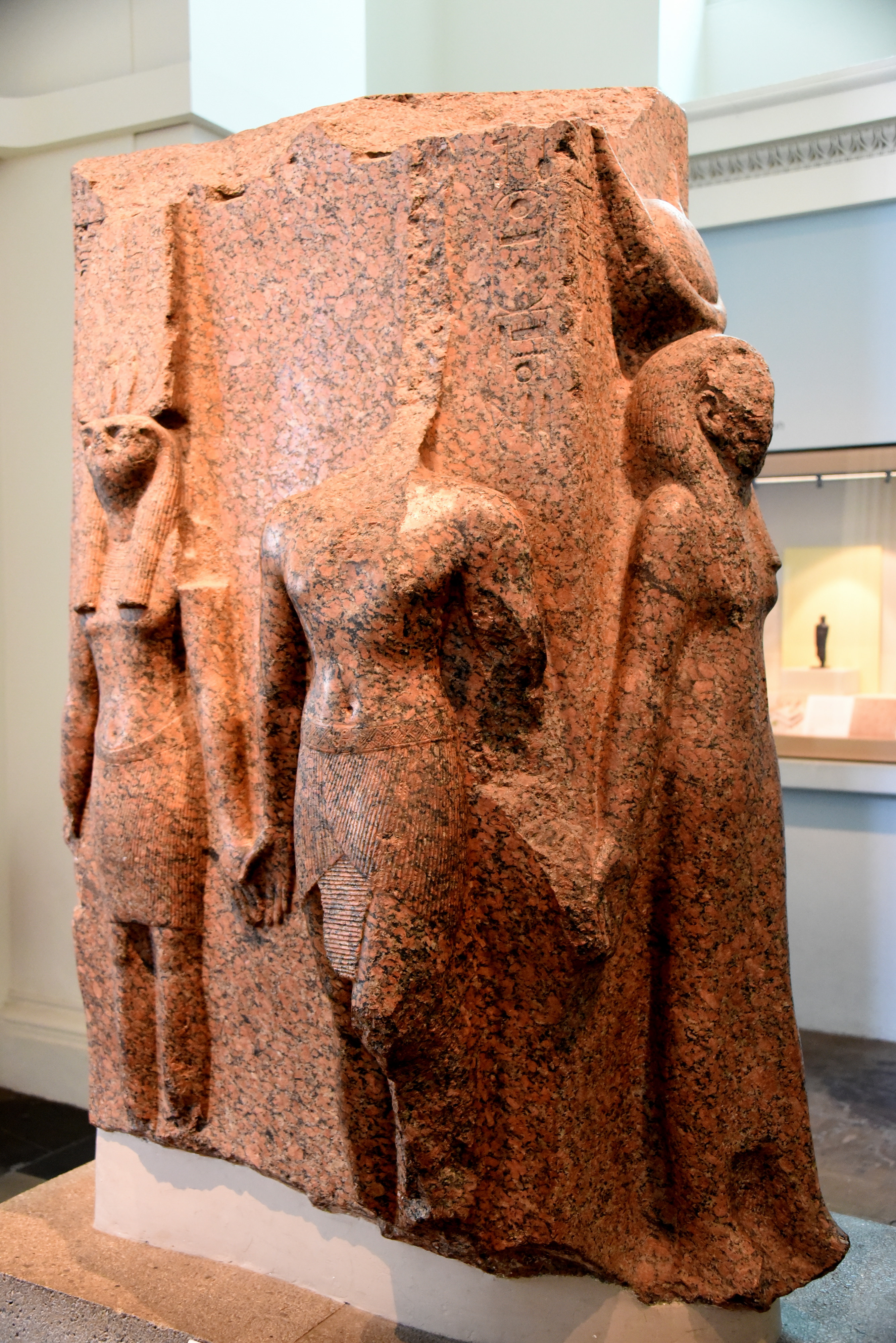 This is a rare example of an Egyptian temple sculpture, in which the figures face in 4 different directions. This suggests that it stood in the middle of a room. Three persons are represented twice. King Thutmose III (now headless) stands hand in hand with the god Montu-Ra (falcon-headed) and the goddess Hathor. By touching the ruler's hand, the gods infuse him with their supernatural powers. 18th Dynasty, reign of King Thutmose III, circa 1479-1425 BCE. From the temple of Amun-Ra at Thebes, Karnak, Egypt. (The British Museum, London).