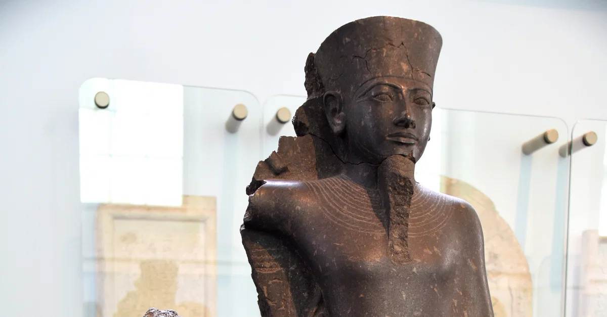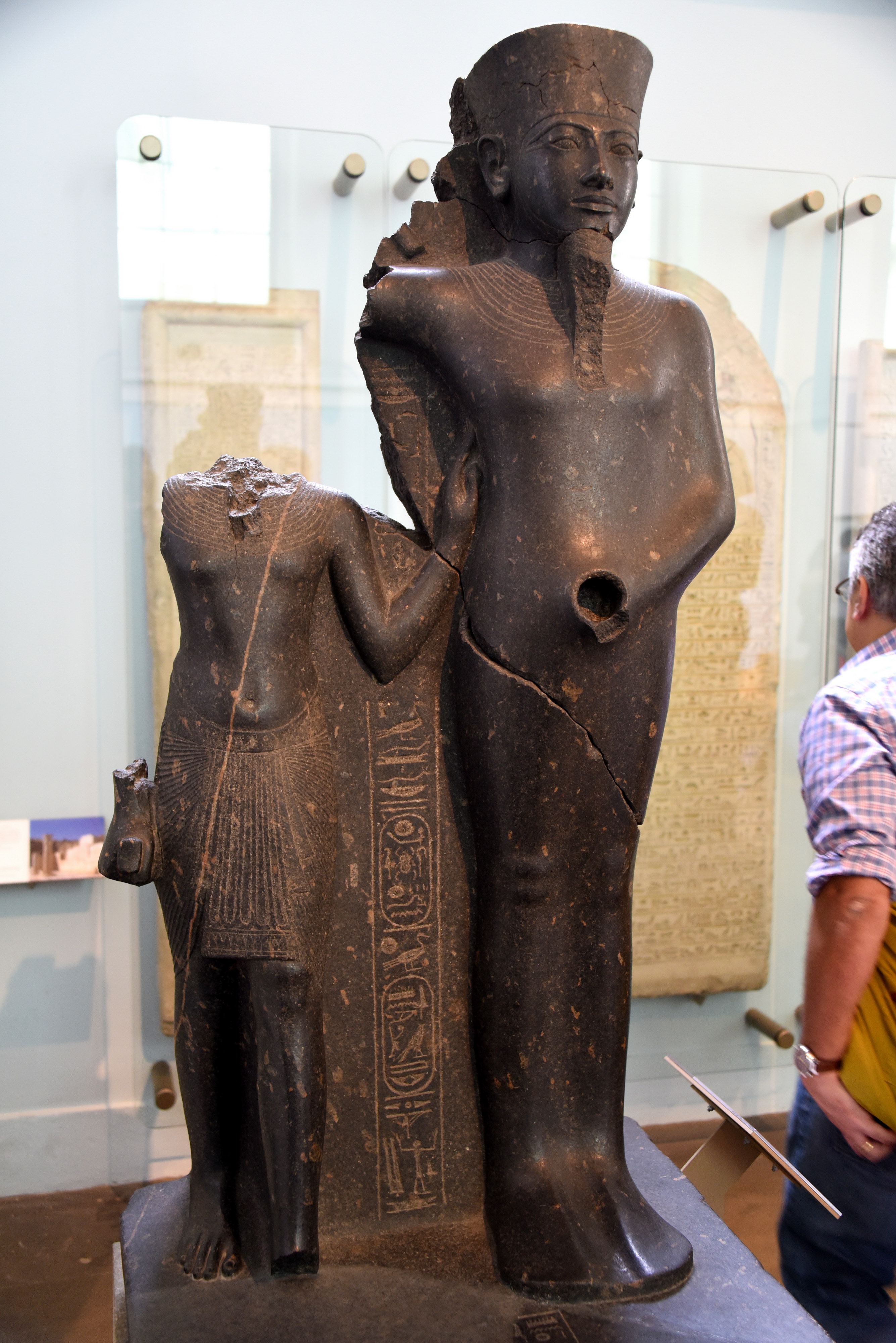 The inscriptions identify the headless king as Horemheb and the larger god as Amnu-Ra, here shown in his fertility aspect. The deity's phallus, now lost, was made separately. The statue was perhaps usurped from Tutankhamun, whose short reign had mostly been steered by Horemheb as regent and commander-in-chief. Numerous temple statues, particularly of Amun-Ram, were made at this time to replace those destroyed during the iconoclasm of Akhenaten's reign.