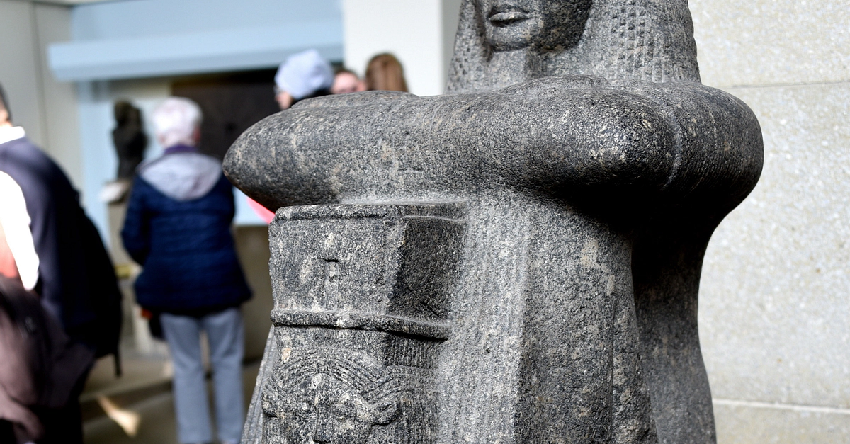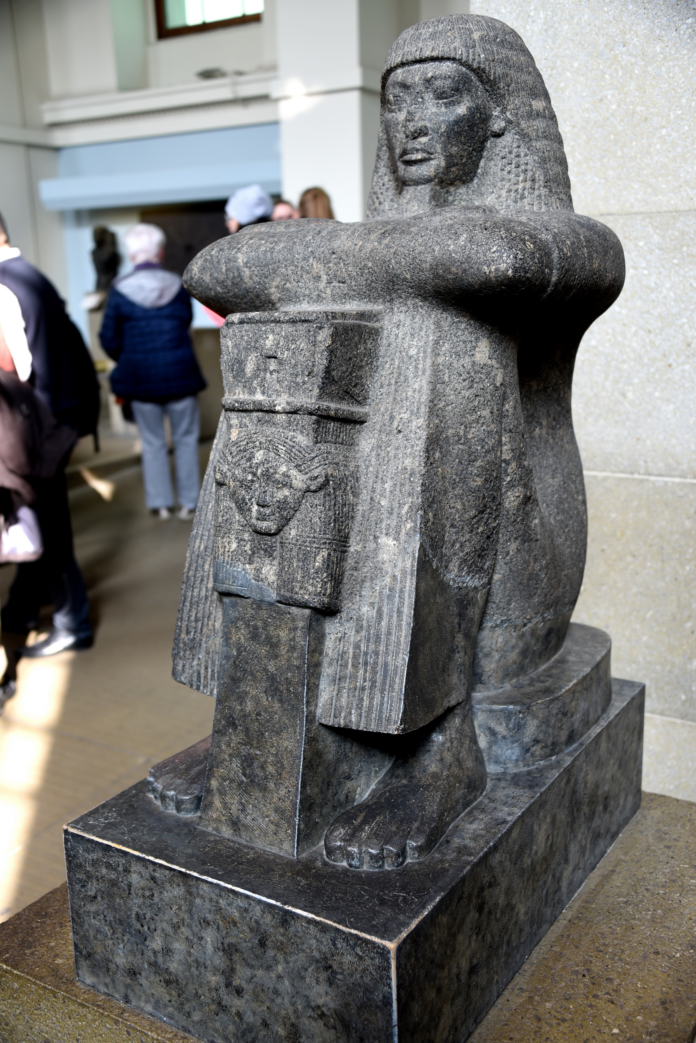 Roy, a well-known high-priest of Amun-Ra in Thebes, squats with his arms crossed on his knees. His long pleated robe was fashionable in the Ramesside period. The text on the back-pillar states that the statue was placed in the temple of Mut, the wife of Amun-Ra. Roy presents a large sistrum, a ritual rattle. This was linked to the cult of Hathor, whose cow-eared face is displayed. The sistrum was alos played for certain goddesses who assumed Hathoric aspects. 19th Dynasty, reign of Ramesses II to reign of Sety II, circa 1220-1200 BCE. From the temple of Mut at Thebes, Karnak, Egypt. The British Museum, London.