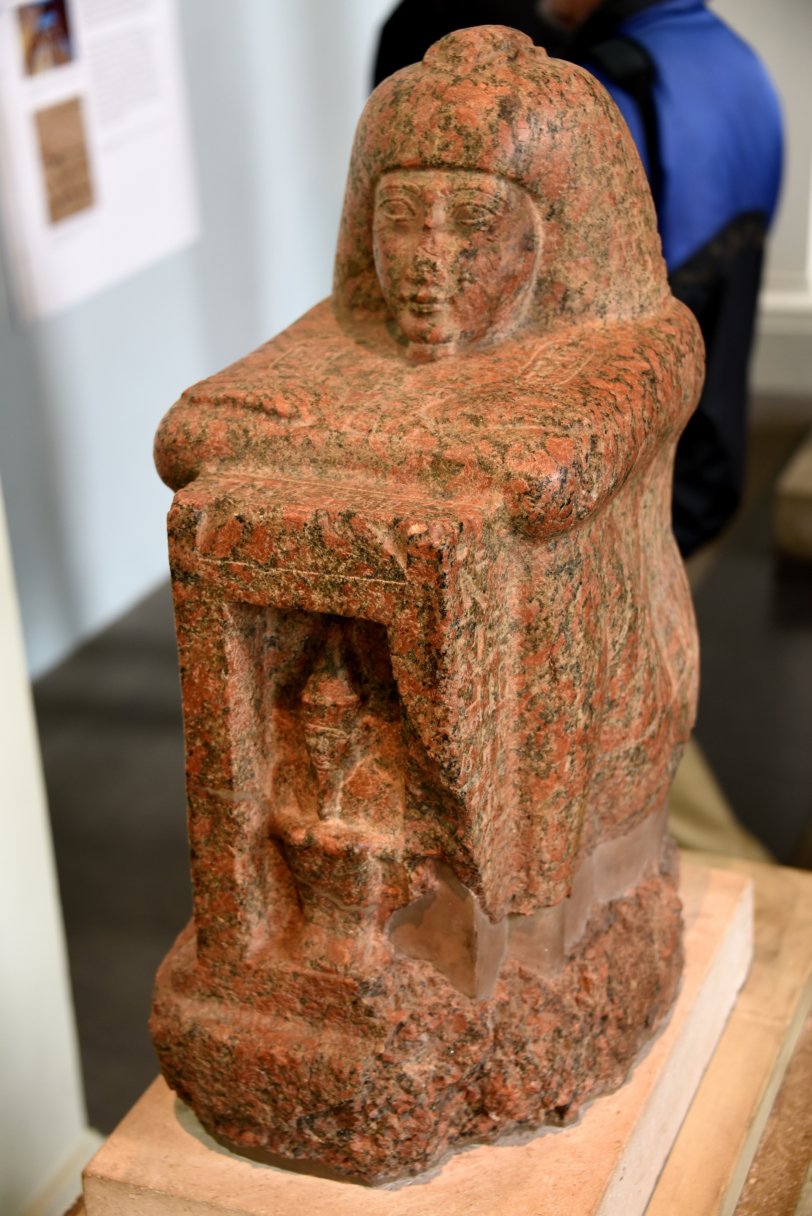 The owner was "a great commissioner of the palace" for Osorkon II, whose cartouches of birth and throne names appear on the upper arm. The shrine he presents contains a figure of Atum, the creator god of Heliopolis. The statue stood in the temple of Atum in Tell el-Maskhuta, on the eastern edge of the Nile Delta. The scarab on the head is an image of Khepri, the morning sun, who had the power of endless rebirth. Khepri was closely identified with Atum, because both gods were supposedly self-created; Khepri at every sunrise, and Atum at the beginning of time. The Heliopolitan gods Ra-Horakhty, Shu, and Tefnut appear in relief on the owner's left side, the Theban triad of Amun, Mut, and Khonsu on his right. Shu and his consort Tefnut, who represented air and moisture, where the 1st gods Atum created. 22nd Dynasty, reign of Osorkon II, circa 874-850 BCE. From the temple of Atum at Tell el-Maskhuta, Egypt. (British Museum, London)