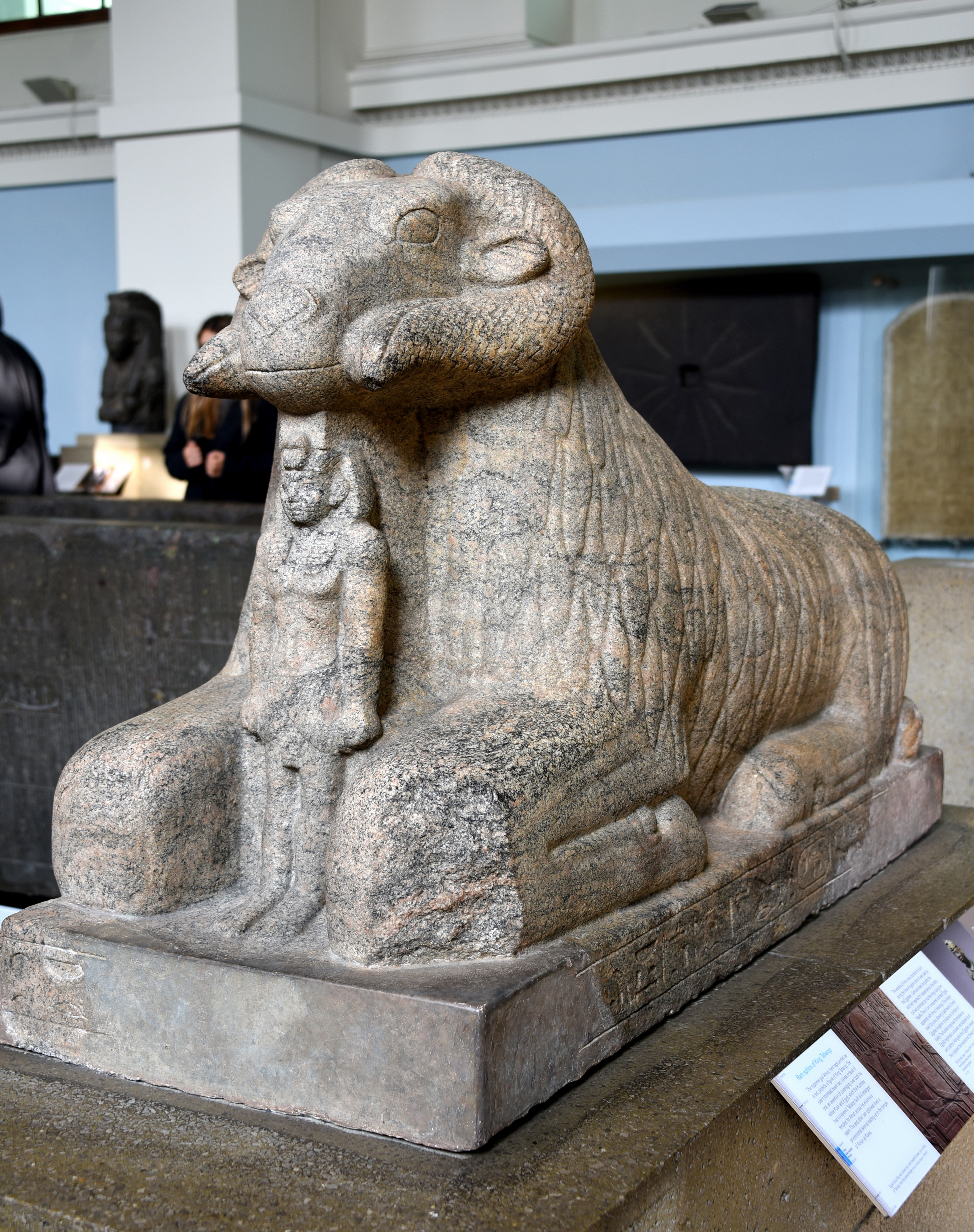 The supreme god Amun represented here as a ram, protects a figure of king Taharqo (Taharqa; Biblical Tirhakah or Tirhaqah). The ruler's forehead of two cobras instead of one, an assertion of sovereignty over both his native Kush and Egypt, which the Kushites had conquered. Taharqo built and enlarged temples of Amun across his enormous realm. This and other ram sphinxes lined a processional avenue leading up to the temple of Amun at Kawa. 25th Dynasty, reign of Taharqo, circa 690-664 BCE. From temple T at Kawa, Sudan. (The British Museum, London).