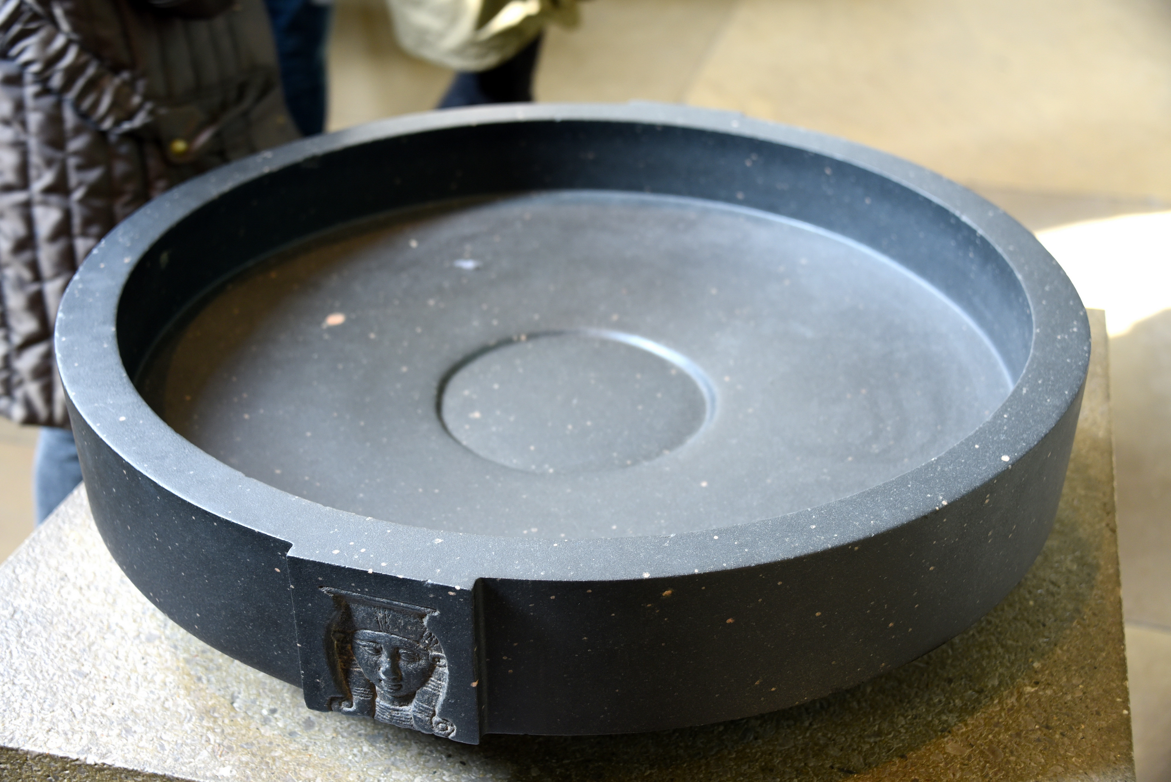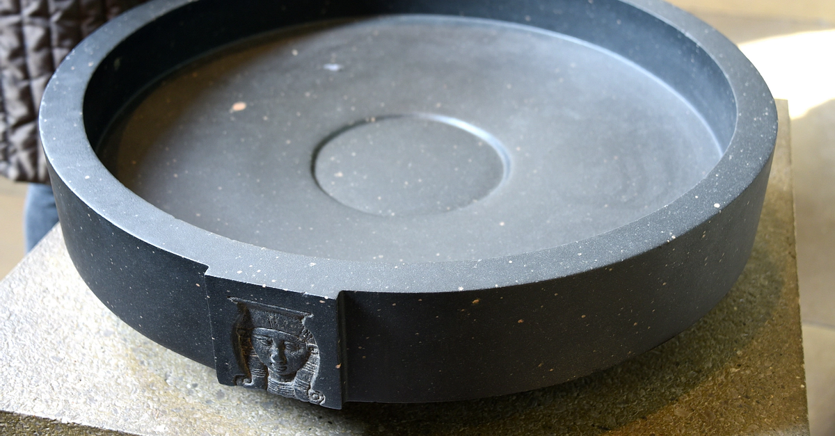 Priests used bowls like this in temples for liquid offerings to the gods. Two faces of the goddess Hathor adorn the rim. Flat depictions of persons were usually in profile, but Hathor's face was widely displayed in frontal view. In such images she has cow's ears, but she could also represented with horns or as a cow. Hathor was Egypt's most universal goddess, and the bowl probably stood in a temple of a different deity. However, it bears no inscription to reveal where this was. 22nd Dynasty, circa 945-715 BCE. Perhaps from Karnak, Egypt. (The British Museum, London).