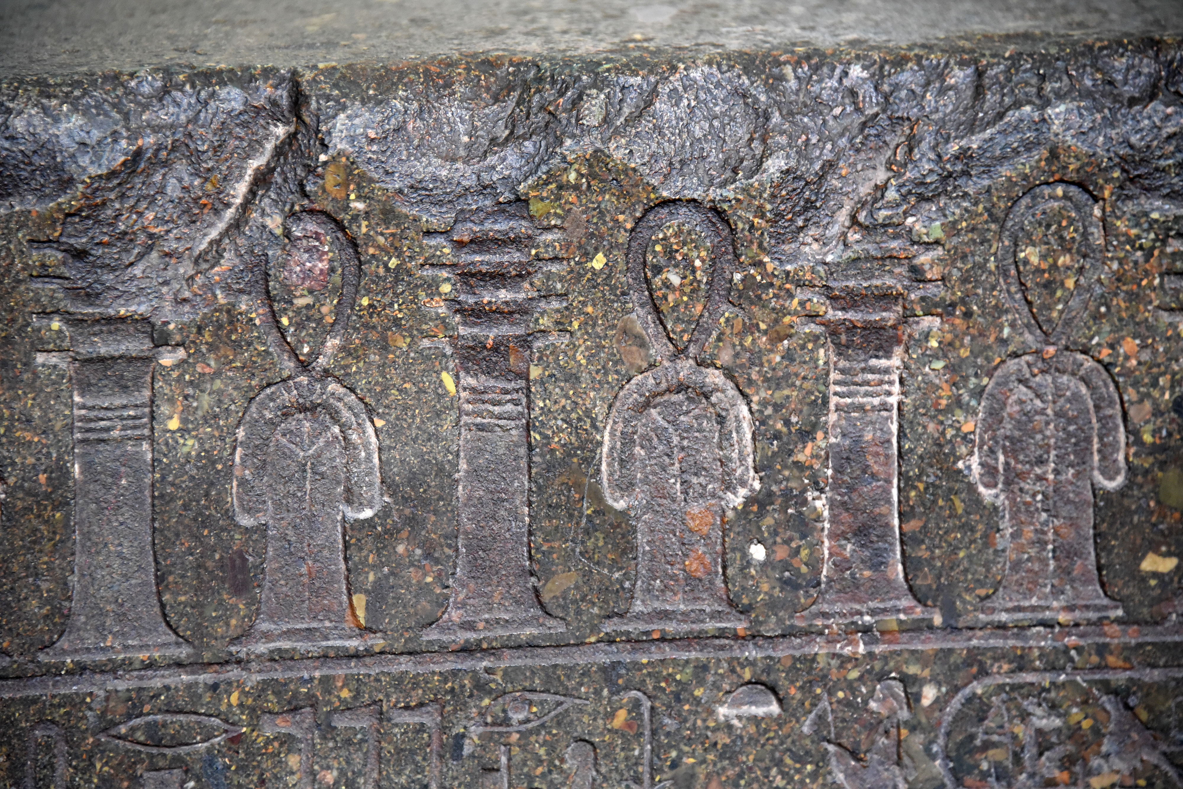 Detail of the upper margin of the sarcophagus of the last native Egyptian pharaoh Nectanebo II showing the so-called "djed" and tyet" symbols. The djed, a pillar-like symbol, represents the backbone (spine) of Osiris, the god of the underworld and afterlife; it actually reflects stability. The tyet, which resembles an ankh except that its arms are curved down, is connected to goddess Isis, and is called the Knot of Isis. 30th Dynasty, reign of Nectanebo II, circa 360-343 BCE. From Attarin Mosque at Alexandria; originally from Samannud, Egypt. (The British Museum, London).