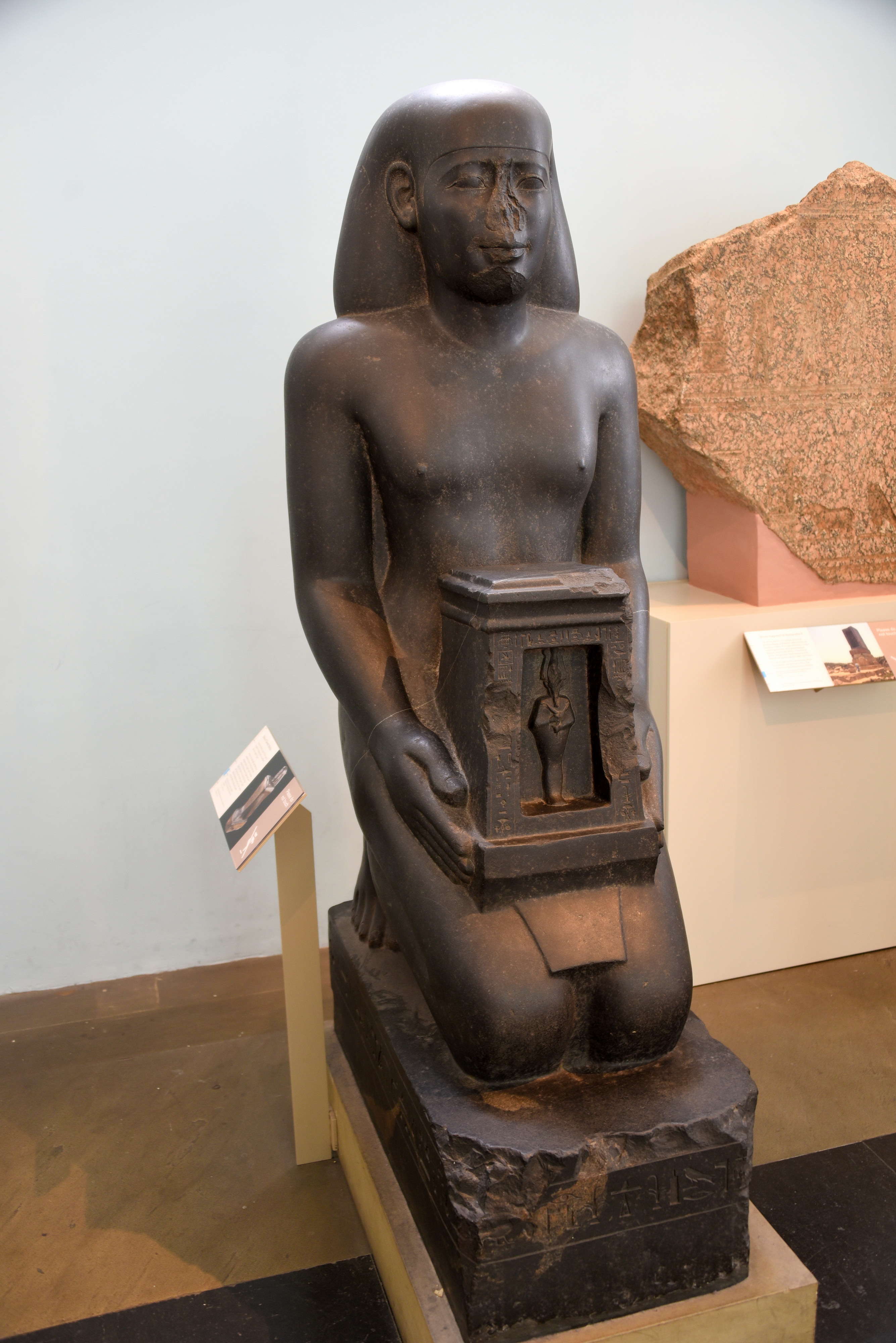 The shrine contains a figure of Osiris, the god of the dead. This statue stood in a temple at Sais, then capital of Egypt. The text on the back-pillar calls Wahibra an "overseer of access of foreign lands (who managed trade on Egypt's southern border), overseer of all armies of Upper and Lower Egypt, chief warrior of his lord (king) in every foreign land". He left at least 12 other statues at temples around Sais. Their number and size reflect his status and wealth. 26th Dynasty, reign of Amasis, 570-526 BCE. Originally from Sa el-Hagar (Sais), temple of Osiris. (The British Museum, London).