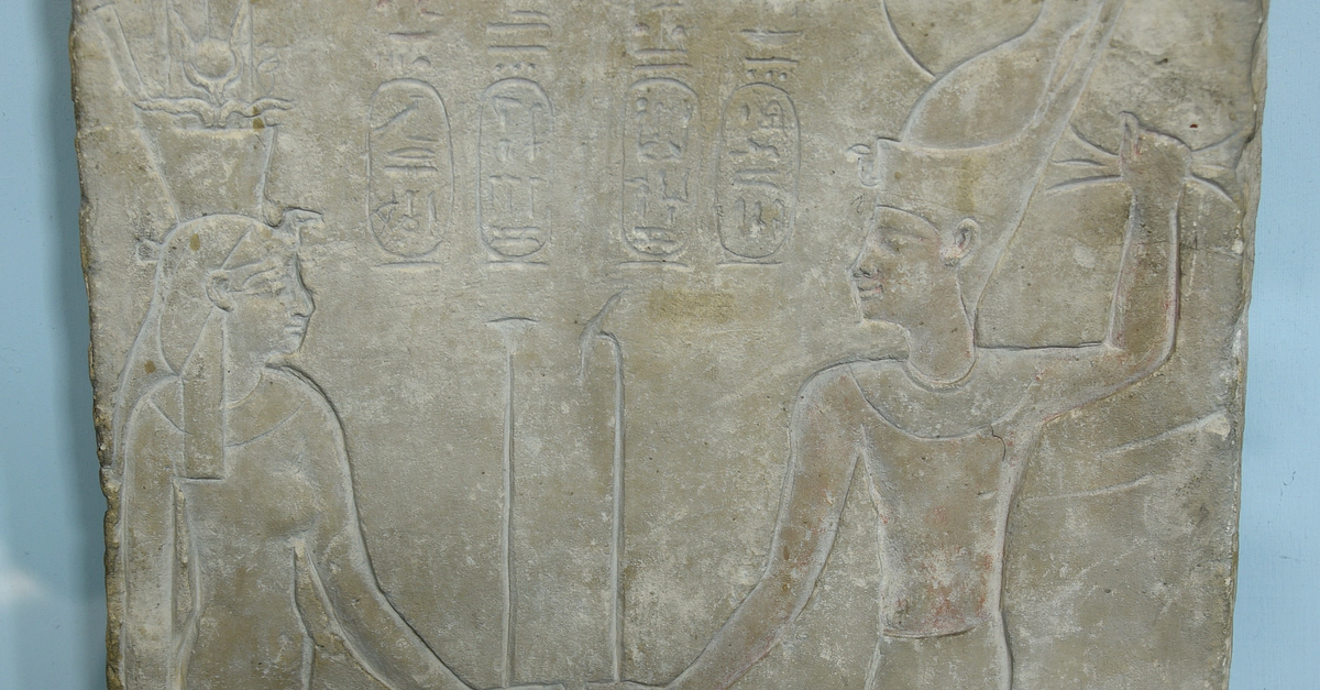 The stela, from a chapel in the royal couple's honors, shows Ptolemy II and Arsinoe II in a deified form. Their staffs are attribnbutes of Egyptian gods, as is the emblem of life (ankh) held by the queen. Yet, unusually, the King wields a lightening bolt; a non-Egyptian motif that identifies him with Zeus, the Greek supreme god of Sky and thunder. This reveals the Greek origins of the Ptolemy ruling dynasty. The Greek equated Zeus with Amun, "king of the gods", outside whose temple in Tanis this stela was displayed. Ptolemaic Period, reign of Ptolemy II, circa 285-246 BCE. From San el-Hagar (Tanis), temple of Ptolemy II, and Arsinoe II, Egypt. (The British Museum, London).