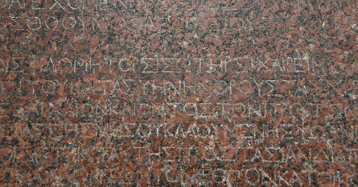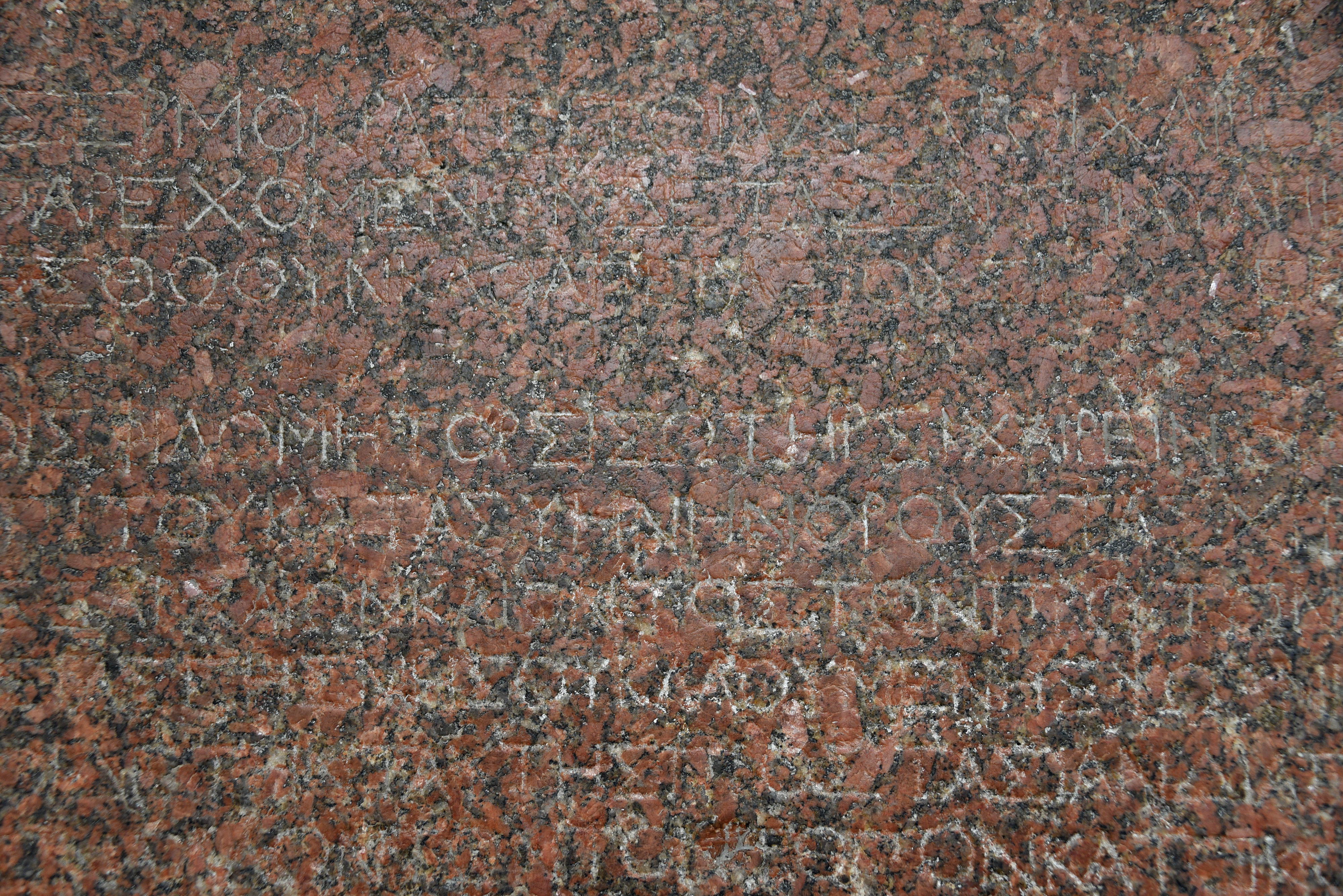 Greek texts were incised on this granite stela. It documents a royal visit to Elephantine. Ptolemy IX and Cleopatra III, his mother and co-regent, granted privileges to the priests of Khnum, a local ram god. There are hieroglyphic inscriptions on the stela, but the main text is in Greek, the official tongue under the Ptolemies. Ptolemaic Period, reign of Ptolemy IX, 115 BCE. From Aswan, presumably from Elephantine, temple of Khnum, Egypt. (The British Museum, London).