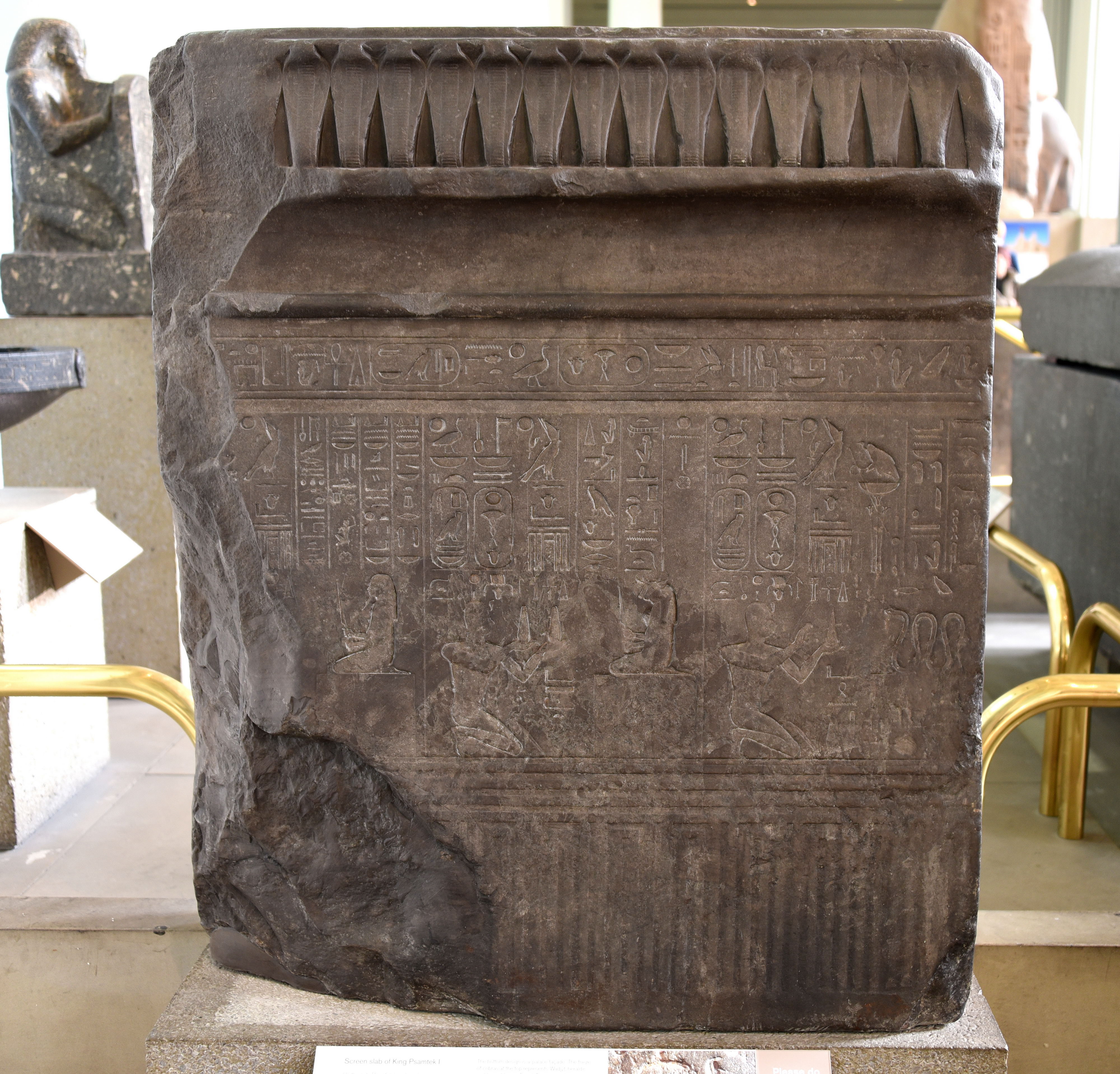 On this side, Psamtek (Psamtik) I kneels making offerings to fearsome-looking deities, including a double-headed bull god and a snake. The majority hold long knives, as they were meant to guard a sacred space located behind this wall. Most Egyptian depictions of people are highly idealized, but here the king's unflattering features suggest a rare attempt at true portraiture. This deviation from the norm is repeated on a similar screen slab made three centuries later. This slab was part of a structure in the temple of Atum at Heliopolis. The bottom design is a "palace facade". The frieze cobras at the top represent Wadjyt, heraldic goddess of Lower Egypt. That side also shows Psamtek offering, but there his figure, now effaced, was more prostrate. 26th Dynasty, reign of Psamtek I, 664-610 BCE. Found in Alexandria; originally from Heliopolis, temple of Atum, Egypt. (The British Museum, London).