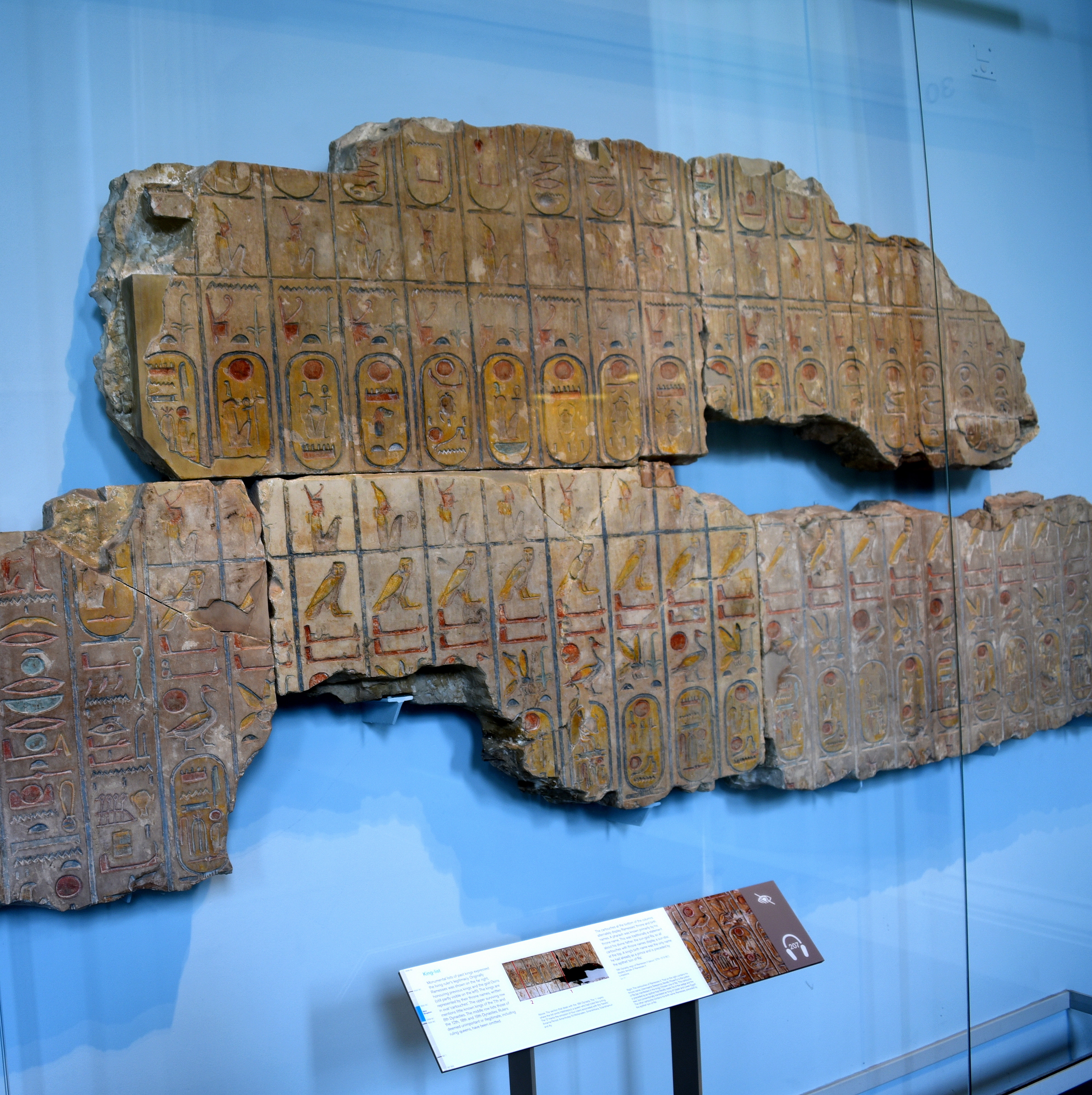 Monumental lists of past kings expressed the living ruler's legitimacy. Originally, Ramesses II was shown on the far right, honoring previous kings and the god Osiris. The kings were represented by their throne names, written inside oval "cartouches". The upper surviving row, mentions little-known kings of the 7th and 8th Dynasties. The middle row lists those of the 12th, 18th, and 19th Dynasties. Rulers deemed unimportant or illegitimate, including ruling queens, have been omitted. A pharaoh was known primarily by his throne name. This was traditionally a statement about his divine father, the sun-god Ra, so all cartouches with throne names display a sun-god at the top. A king's birth name was the only name he had already as a prince and is preceded by the epithet "son of Ra". 19th Dynasty, reign of Ramesses II, circa 1279-1213 BCE. From the temple of Ramesses II at Abydos, Egypt. (The British Museum, London).