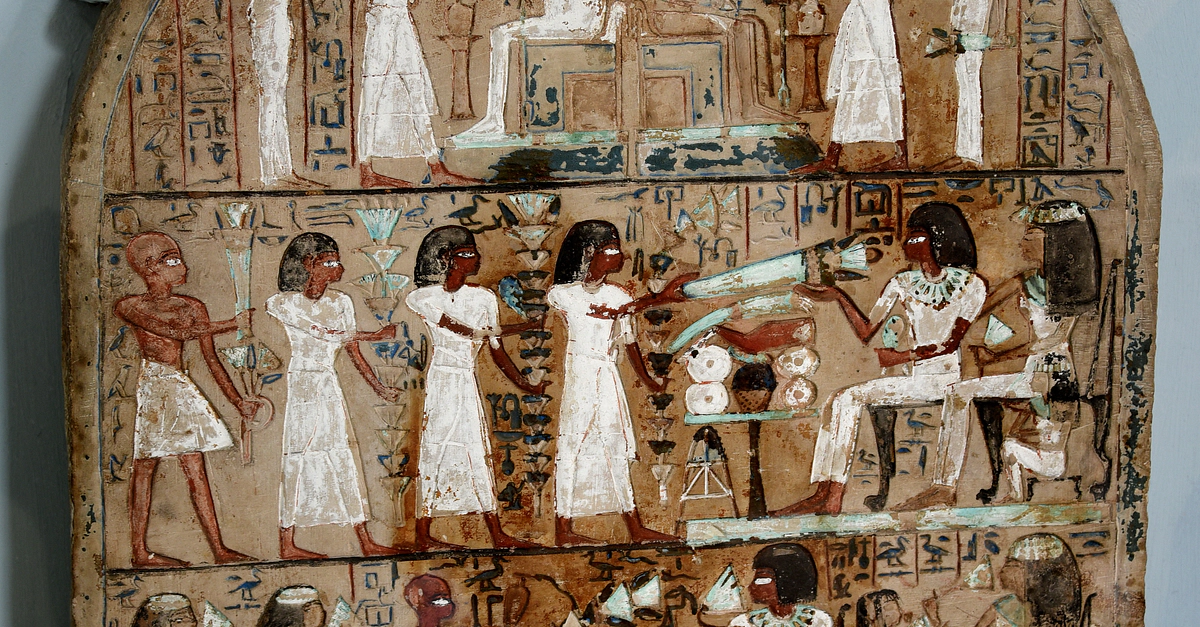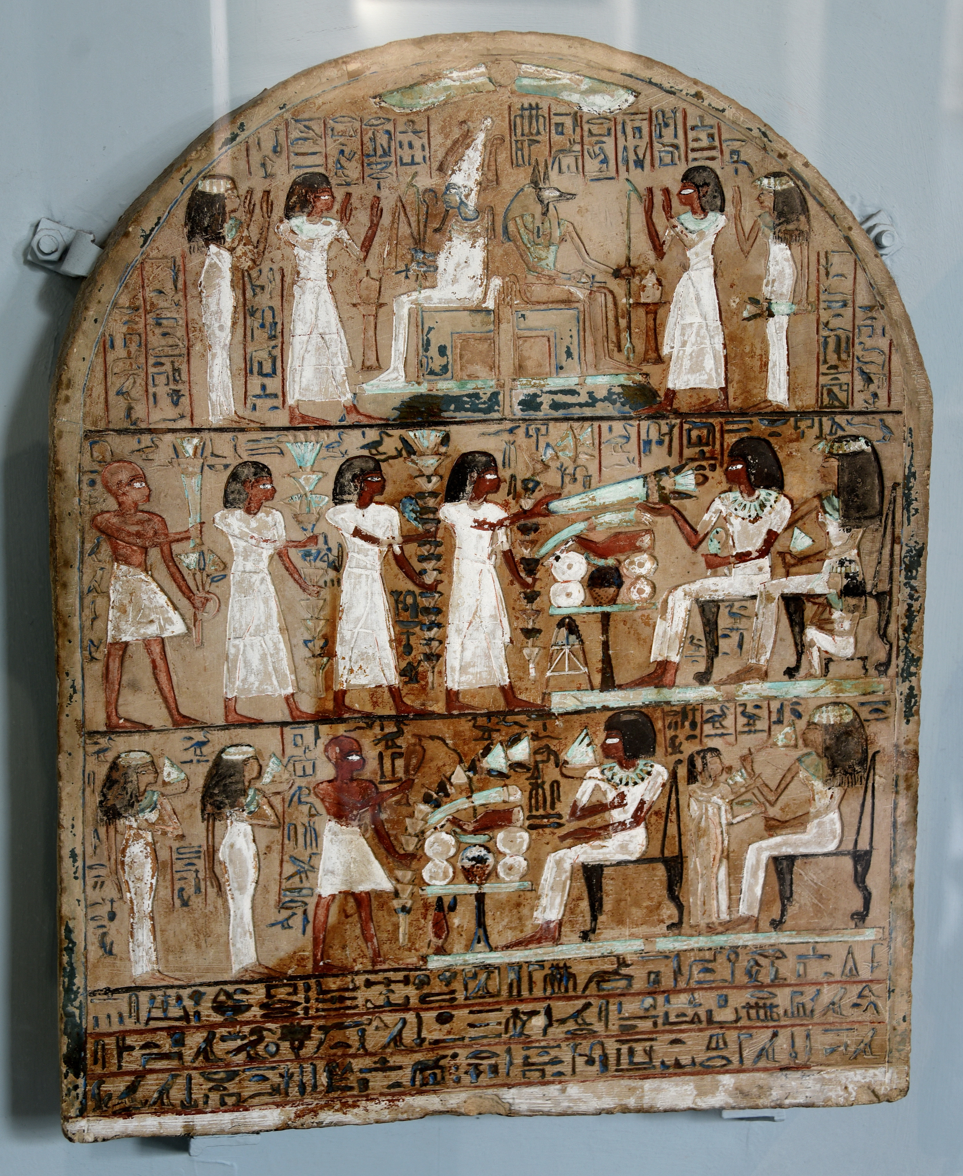 Sobekhotep , the scribe of a wine-cellar, appears three times with his wife. In the mirroring scenes at the top, they worship the gods of Osiris (left in the form of a mummy) and Anubis (right, Jackal-headed). In the next scene, they are joined by a daughter on a tiny stool, receiving offerings presented by their four sons. More sons and daughters appear in the bottom scene. 18th Dynasty, reign of Amenhotep III, 1390-1352 BCE. From Abydos, Egypt. (The British Museum, London).