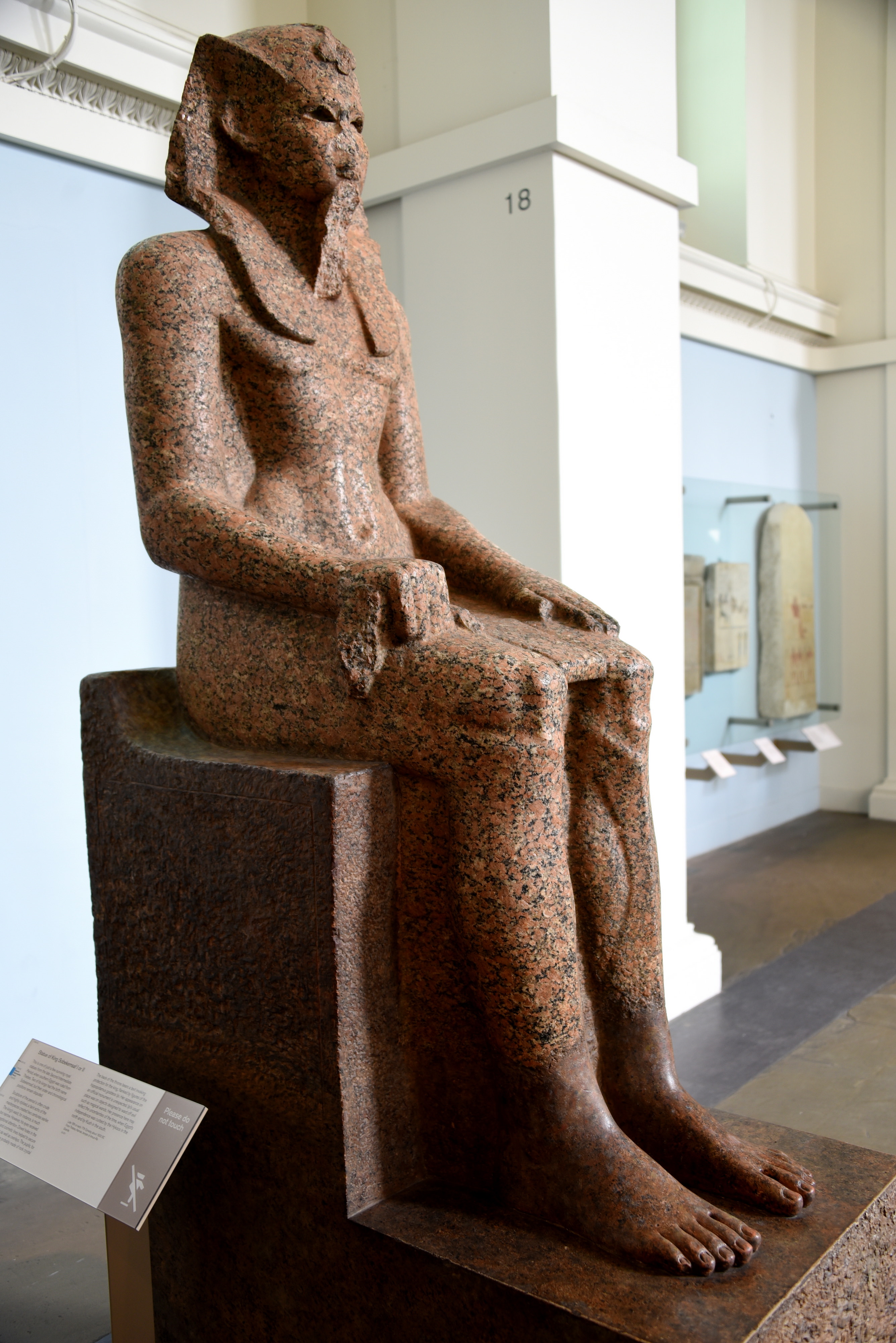 This is one of just a few surviving royal statues from the late Second Intermediate Period, when southern Egypt was ruled from Thebes. Two of its kings had the birth name of Sobekemsaf, but their order and chronological potions remain disputed. Sculpture from this period is often crude and highly stylized, a faint echo of masterpieces created two centuries earlier. The King's waist, for instance, is much too narrow. However, his eyes received exceptional attention. Dowel holes in the brows and cosmetic lines helped to secure inlaid eyes and as well as overlays. The pupils, for instance, were probably made of rock crystal or obsidian. The back of the throne bears an inscription which invokes protection for the king, flanked by the figures of the hippopotamus goddess Ipi. Her appearance on an official monument is unusual. Ipi's usual place was on objects designed to ward off evil, such as magical wands. Her presence here may reflect the uncertainties of the time, even when Egypt's independence was curbed by the Hyksos in the north and by Kush in the south. Late 16th or early 17th Dynasties, circa 1600 BCE. From the temple of Amun-Ra at Thebes, Karnak, Egypt. (The British Museum, London).